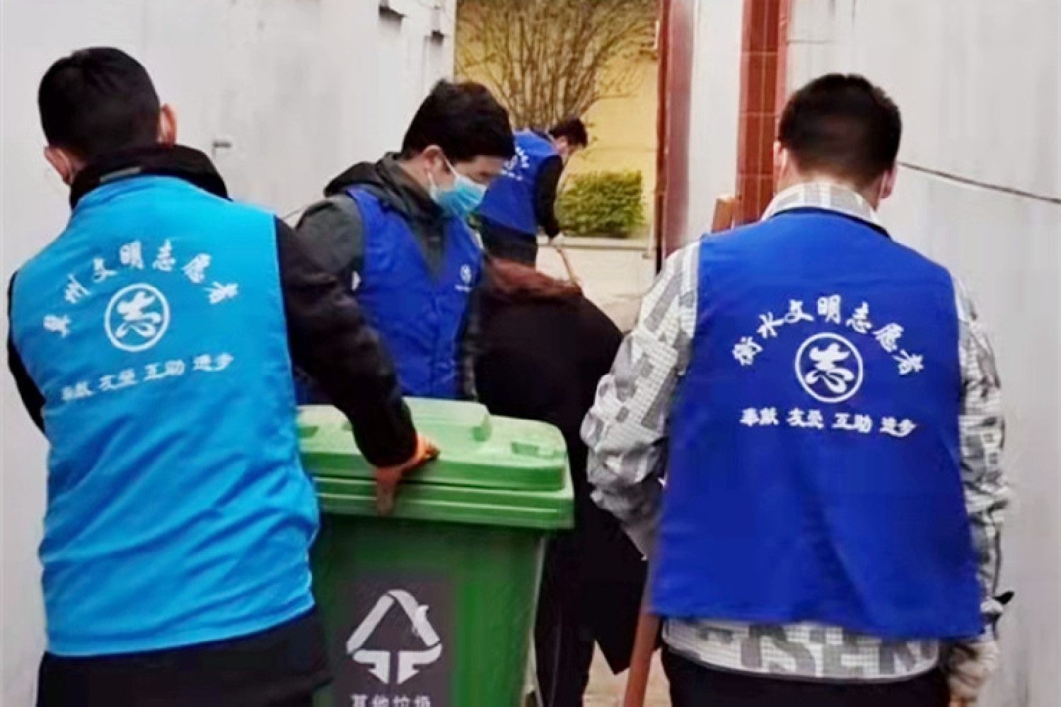 冀州区行政审批局志愿者深入小区整理垃圾箱。冀州区行政审批局供图