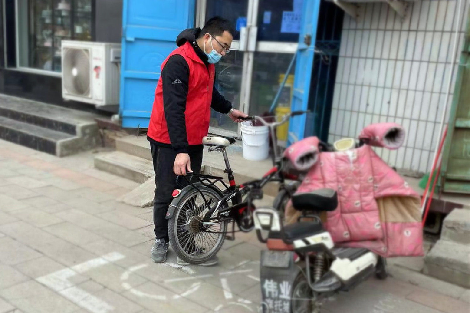 冀州区司法局志愿者整理路旁停放的电动车。冀州区司法局供图