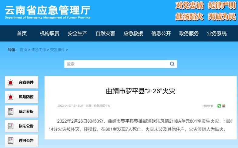 4月7日,云南省应急管理厅发布通报,2月26日8时50分,云南省曲靖市罗平县罗雄街道欧陆风情21幢A单元801室发生火灾,10时14分火灾被扑灭。经搜救,在801室发现7人死亡,火灾未波及其他住户。火灾涉嫌人为纵火。