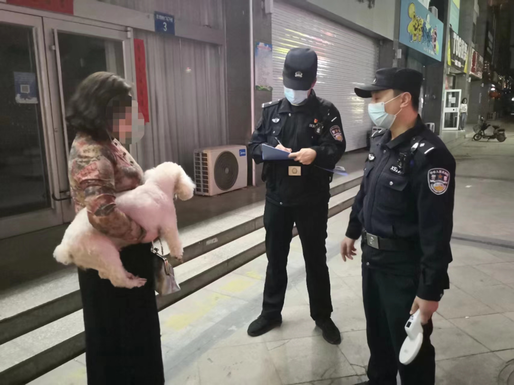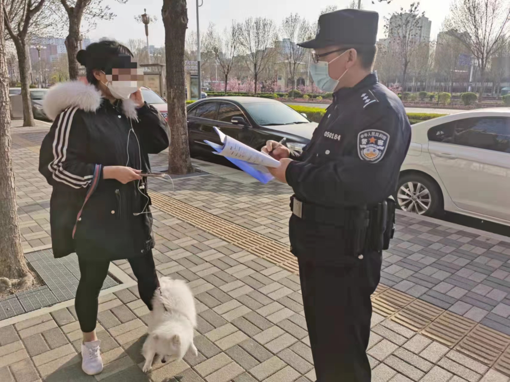 4月9日晚,在康宁街便道上,一只未拴绳的小狗正在乱跑,它的主人则慢悠悠地跟在后头。直到看到民警走过来,狗主人才跑上前来抱起狗,为它拴上绳子。民警告知犬主,根据《条例》第二十一条第二款规定,养犬人携带犬只外出的,应当由完全民事行为能力人为犬只束1.5米以内的牵引带带领,或者怀抱、装入犬袋犬笼。随后,民警根据《条例》相关规定,对犬主进行警告并处以罚款。