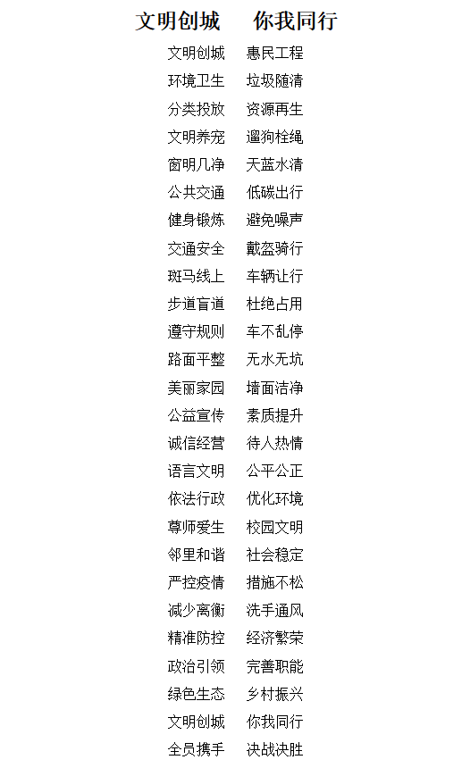 “讲给俺们老百姓的创城知识就是要接地气!”村民们告诉记者,整首创城顺口溜只有208个字,四字一句,细品之下,一句句顺口溜涵盖了极为丰富的内容:既有“文明养宠”“低碳出行”,也有“邻里和谐”“尊师爱生”,并涵盖有“诚信经营”等内容。其中最令人眼前一亮的,是顺口溜还涵盖了新冠肺炎疫情常态化防控、绿色生态、垃圾分类等社会治理热点问题,获得了乡亲们的一致好评。