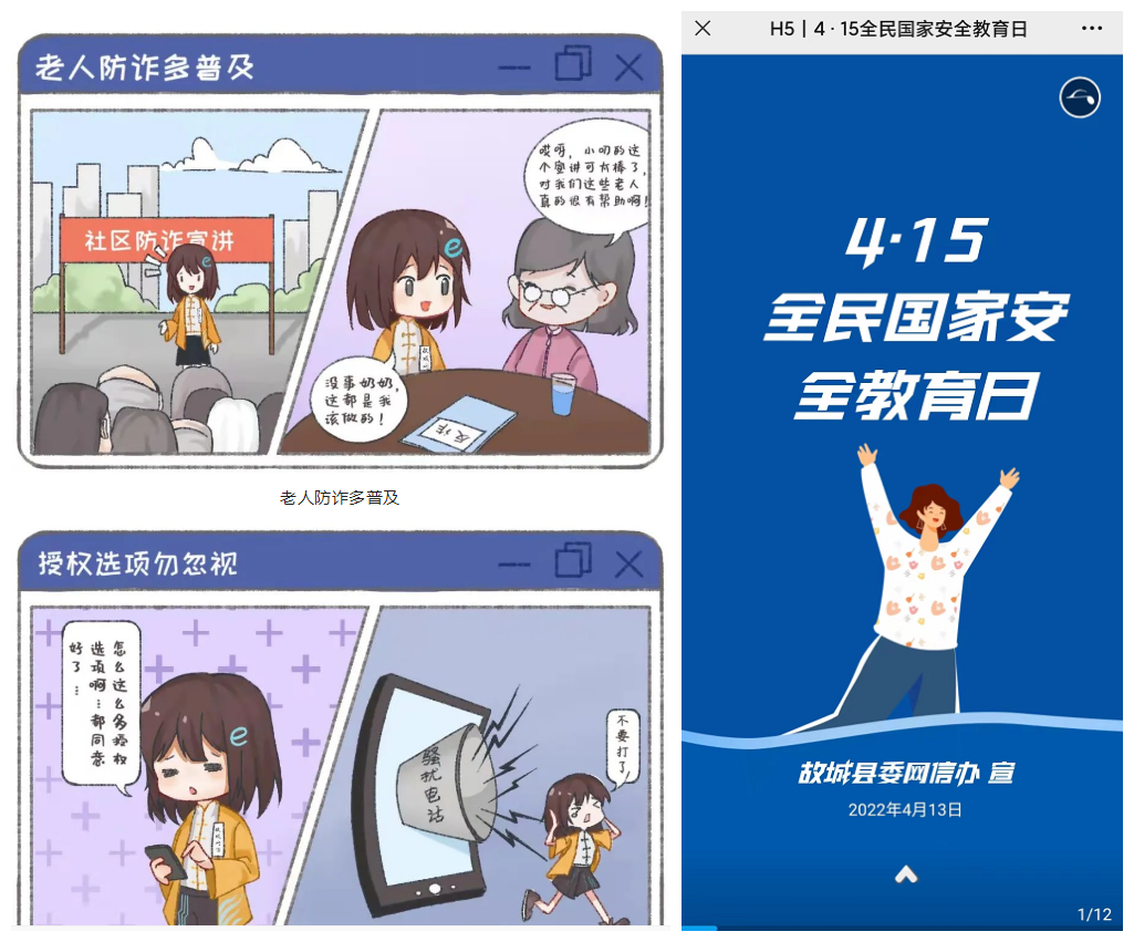网上宣传“交响曲”。开设“‘4·15’全民国家安全教育日”“网信普法”等专题专栏,在公众号、抖音、快手等平台持续发布国家安全教育相关图文音视内容,并动员各政务新媒体账号及时跟进转发。围绕安全上网、防诈骗、个人信息保护等内容以“故小叨”原创IP形象制作了3期漫画作品,达到了寓教于乐、以乐促学的效果。及时推出网络安全小知识H5,浏览量突破10000+。