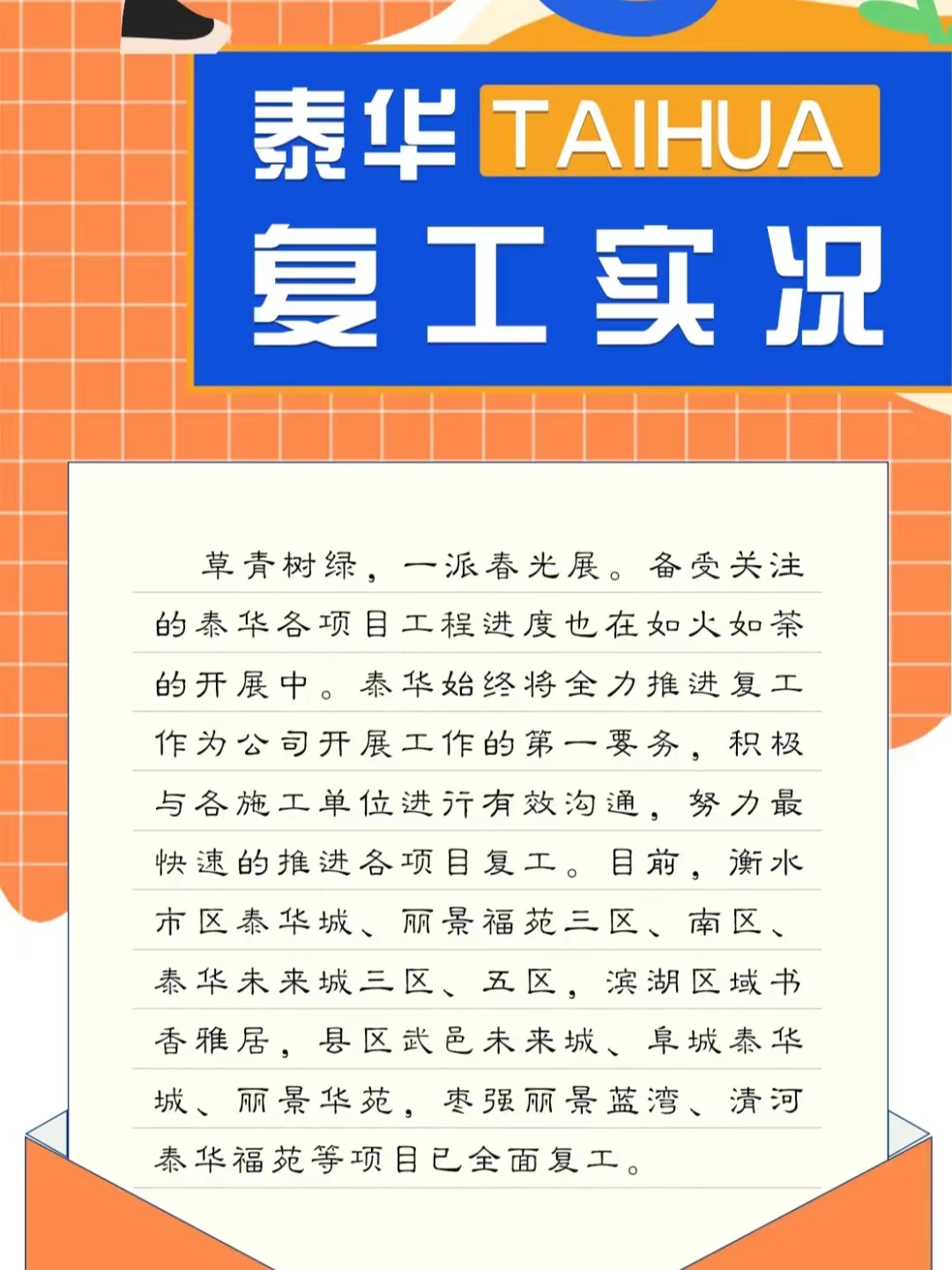 连日来,备受关注的衡水泰华地产各项目复工情况有了新进展。泰华地产积极与各施工单位有效沟通,努力最快速地推进各项目复工。目前,衡水市区泰华城、丽景福苑三区、南区、泰华未来城三区、五区,滨湖新区书香雅居项目,县区各项目已全面复工。 来源:泰华锦业地产微信公众号 点赞 +1 微博 微信 我要评论 发布 相关推荐 泰华地产阜城·旭景悦城交付背后的故事 湖城楼市 2022-06-14 泰华地产丨阜城·旭景悦城二期交付 湖城楼市 2022-06-06 泰华地产丽景福苑三期、南区、泰华城项目全面复工 湖城楼市 2022-04-20 衡水泰华·未来城(三、五区)项目全力复工 湖城楼市 2022-04-19 湖城地产“3·15”品质好房联展之:泰华·书香雅居 湖城楼市 2022-04-08 湖城地产3·15品质好房联展之:泰华学府 湖城楼市 2022-03-15 湖城地产3.15品质好房联展之:泰华学府 湖城楼市 2022-03-15 湖城地产3.15品质好房联展之:泰华学府 湖城楼市 2022-03-15 热门 一天 三天 一周 1 衡实学子勇夺河北省第十七届运动会首金 2 学习手记|既要做显功,也要做潜功 3 对话 在雄安丨“我觉得她就是我的第二故乡!” 4 廊坊只有红楼梦·戏剧幻城依托文学IP打造新型文化业态 5 “服务区像景区” 河北196对高速服务区焕新亮相 6 河北发布“人工智能+”典型案例 7 安平台城:传承红色基因 书写时代答卷 ——衡水市文化建设走笔之一 8 冀时长图丨起步有力!河北1-2月经济指标稳步增长、新动能加速成长 9 打开雄安的九种方式(六)丨在白洋淀邂逅“江南水乡” 10 衡水市排水管理中心扎实开展春季清淤疏浚专项工作 1 高职单招考试3月21日开考 衡水9300余名考生将参加考试 2 “白牌”电动自行车还能骑吗? 衡水晚报“帮办”核实:已全面禁行,违规上路会受罚 3 315金融观察|大地财险罚单密集落地,暴露合规短板 4 【新闻发布】聚焦科技赋能 衡水绘就营商环境新图景 5 枣强县第四届杏花文化宣传推介会邀您共赴春日之约 6 探秘气象“大本营” 解锁防灾新密码 饶阳县气象局举办世界气象日科普开放活动 7 【新闻发布】锚定便民利企目标 衡水发布2026年自然资源营商环境新蓝图 8 以鱼养水净河道 2万余尾草鱼苗放流滏阳河衡水市区段 9 315金融观察|瑞众保险登315金融投诉黑榜,“欺骗投保人”成顽疾 10 “世界水日”将至 衡水水务走进同乐里社区普及健康用水知识 1 拾光纪·马年再会老朋友,上个马年他赠予习近平一匹汗血马 2 全国两会中的“衡水声音”获央媒省媒持续关注 3 衡水市上半年教师资格认定3月20日起报名 4 衡水湖畔:山桃花盛放 吸引市民踏春赏景 5 衡水推出不动产“带封过户”改革 6 家门口来了北京专家! 衡水五院牵手首都医科大学三博脑科医院共建医联体 7 以赛促学启新程 科创育人谱新篇——衡水市第九届中小学机器人创客竞赛圆满举办 8 衡水文旅春日上新 十大场景开启沉浸式春游新体验 9 【新闻发布】锚定“五最”目标 衡水市发布优化营商环境“新蓝图” 10 【撸起袖子加油干 风雨无阻向前行】河北水利投资连续两年破千亿元 广告 广告 广告 24小时 1 高标准高质量推进雄安新区建设现代化城市|雄安的早晨 2 强强对决,燃爆全场!“河北五超”半决赛首回合上演足球盛宴 3 对话 在雄安丨① 悦读雄图 4 冀时评丨从开年成绩单看燕赵涌春潮 5 世界水日·AI长图丨一滴水的燕赵“网”游 6 “十五五”开好局起好步丨把绿水青山这张“金名片”擦得更亮 7 算力变“智力”,张家口“风”“光”点亮数字经济 8 沃野铺锦绣 乡村绽芳华——唐山市路南区扎实推进和美乡村建设 9 安平台城:传承红色基因 书写时代答卷 ——衡水市文化建设走笔之一 10 随时随事议!饶阳县桥西社区“小院议事厅”解民忧