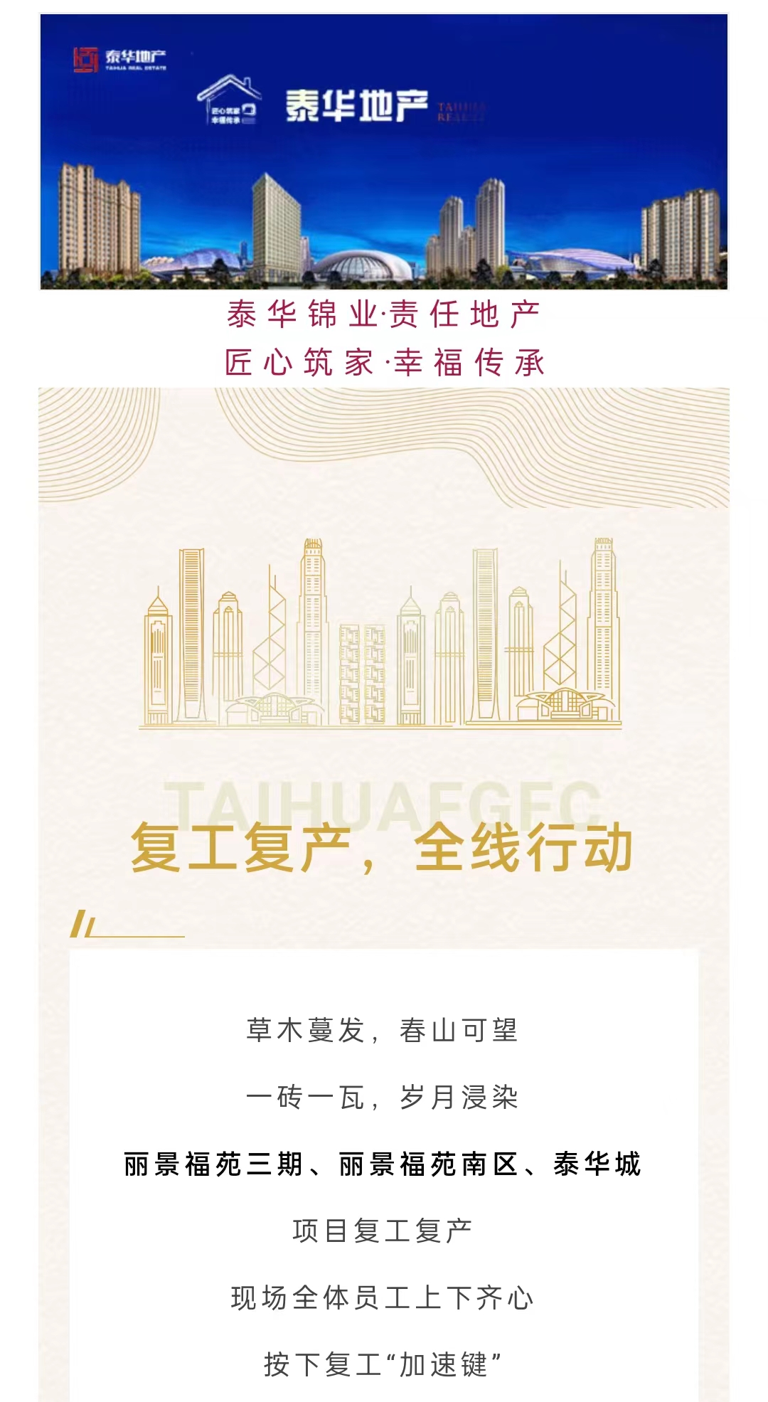 连日来,衡水地产市场好消息频传。备受关注的泰华地产各项目复工情况有了最新进展。目前泰华地产市区及县域多个项目已经全面复工,集团上下全力以赴赶工期。 点赞 +1 微博 微信 我要评论 发布 相关推荐 2023衡水春季住房博览会之城南名盘:泰华·丽景福苑南区 湖城楼市 2022-09-21 泰华地产枣强丽景蓝湾项目召开保交付誓师大会 湖城楼市 2022-07-07 泰华地产阜城·旭景悦城交付背后的故事 湖城楼市 2022-06-14 泰华地产丨阜城·旭景悦城二期交付 湖城楼市 2022-06-06 衡水 泰华地产丽景福苑南区复工 湖城楼市 2022-04-22 泰华·丽景福苑尚园 公园环绕的家 湖城楼市 2020-05-20 热门 一天 三天 一周 1 衡水市开展“诚信3·15,信用伴我行”主题宣传活动 2 阜城霞口镇刘老人村百年梨园春管正当时 3 跃马扬鞭向新程 青春奋进正当时 —— 衡水滨湖新区志臻中学崔帅强校长开学思政第一课暖心开讲 4 衡水市阜城县:多部门联动护航春灌备耕 全力保障冬小麦返青丰产 5 【“十五五”开局看衡水】实干兴企 产业添劲 ——阜城县以项目为基筑牢产业根基 6 宋平同志遗体在京火化 习近平等到八宝山革命公墓送别 7 气温回暖年货干果易霉变 衡水市人民医院消化内科医生提醒:出现这三种情况切勿食用 8 两会“冀”语·会内会外 | 两则就医小故事上了代表通道 9 衡水全力加强麦田春管夯实夏粮丰收基础 10 【弘扬诚信文化】衡水市桃城区数政局开展“诚信3·15 信用伴我行”主题宣传活动 1 “巾帼芳华 为爱赴约” 衡水市总工会举办青年职工相亲交友活动 2 央媒省媒关注全国两会中的“衡水声音” 3 政策宣讲 岗位对接 衡水市开展“春风行动”招聘会暨“情暖三八 社保护航”主题宣传活动 4 瓜田“土专家” 共富“领头雁” ——记阜城县高级农艺师何国仓 5 阜城县企业数字化转型培训会赋能产业转型升级 6 衡水雷锋精神书画展览馆举办“三八”国际劳动妇女节主题活动 7 衡水市开展“诚信3·15,信用伴我行”主题宣传活动 8 白天上班,晚上学艺!桃城区青年文化夜校2026年第一期开始报名啦 9 书香润巾帼 悦读绽芳华 衡水市图书馆开展阅读活动庆“三八” 10 一场制造业的“数字春雨”——衡水市景县优化营商环境一线探访 1 那藏不住的情怀与思考——读杨新城《抱愧衡中》有感 2 《中华人民共和国献血法》首次修订——这些变化和每位献血者有关 3 衡水市冀州区举办2026年“春风行动”专场招聘会 4 火炬传递暖湖城 雷锋精神永传承 全国百城全民传递雷锋·林秀贞双百人物火炬(衡水首站)启动仪式成功举办 5 武强县农业农村局:雪后农技送服务 春季田管正当时 6 衡水籍拳手靳金城泰国赛场连克强敌 斩获ABF金腰带挑战资格 7 衡水阜城:元宵喜乐会热闹开演 民俗非遗齐上阵添年味 8 麦粒“画”雷锋!阜城县霞口镇创新形式激活青少年思政课堂 9 衡水中小学教师资格笔试3月7日开考 10 喜迎新学期 安全伴成长——衡水市人民路小学开启新学期新篇章 广告 广告 广告 24小时 1 河北衡水:湖城春景入画来 2 气温回暖 衡水处处春意浓 3 学习新语·两会|同心共圆中国梦 4 习言道|总书记的两会约定 5 一习话·习近平的两会时间丨“练好内功、做强自身” 代表们这样说 6 衡水农商银行对接市商务局做好“三服务” 7 衡水全力加强麦田春管夯实夏粮丰收基础 8 【弘扬诚信文化】衡水市桃城区数政局开展“诚信3·15 信用伴我行”主题宣传活动 9 武邑县电商人才培训为乡村振兴注入新动能 10 气温回暖年货干果易霉变 衡水市人民医院消化内科医生提醒:出现这三种情况切勿食用