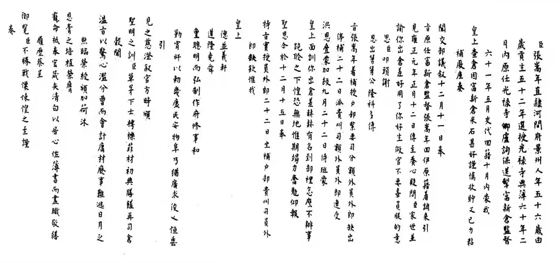 奏折显示:“臣张嵩年,直隶河间府景州人,年五十六岁。由岁贡生(康熙)五十二年(1713年)选授光禄寺典簿,(康熙)六十年(1721年)二月内原任光禄寺卿,卢询(清朝知名官员)保送,掣富新仓监督,(康熙)六十一年五月交代回籍,十月内蒙我皇上查仓,因富新仓米石甚好,谨慎收储,仗己力粘补廒(áo,粮仓)座,奏闻交部议叙。十二月十一日奉旨:‘原任富新仓监督张嵩年回伊原籍,着调来引见'……”张嵩年介绍了自己的出身及经历,和自己面见皇上的来由。从这段文字,我们还可得到的信息是,康熙皇帝在驾崩(康熙死于1722年12月20日)一月前还在查粮仓,知道张嵩年做富新仓监督管理得好,而让户部议叙张嵩年的升迁,可见康熙皇帝的敬业精神,而康熙朝盛世和康熙皇帝的这种敬业精神是密不可分的。