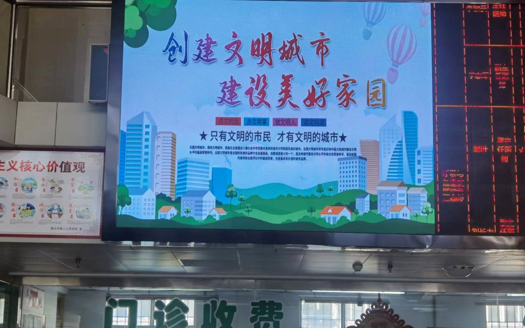 医院不断丰富文化建设内涵,把“厚德 精诚 创新 奉献”的院训融入医疗行为规范,充分利用院内人流量大的特点,将公益广告播放与群众教育相结合,门诊楼内电子大屏播放文明短片,墙面、立柱、电梯等醒目部位张贴创建公益海报,内容涵盖社会主义核心价值观、讲文明树新风、图说我们的价值观、法治精神、文明交通、文明礼仪、家风家教等各方面内容,教育引导医院职工和广大群众养成良好的文明生活习惯,自觉遵守社会公德,提高自身品格和素质修养。