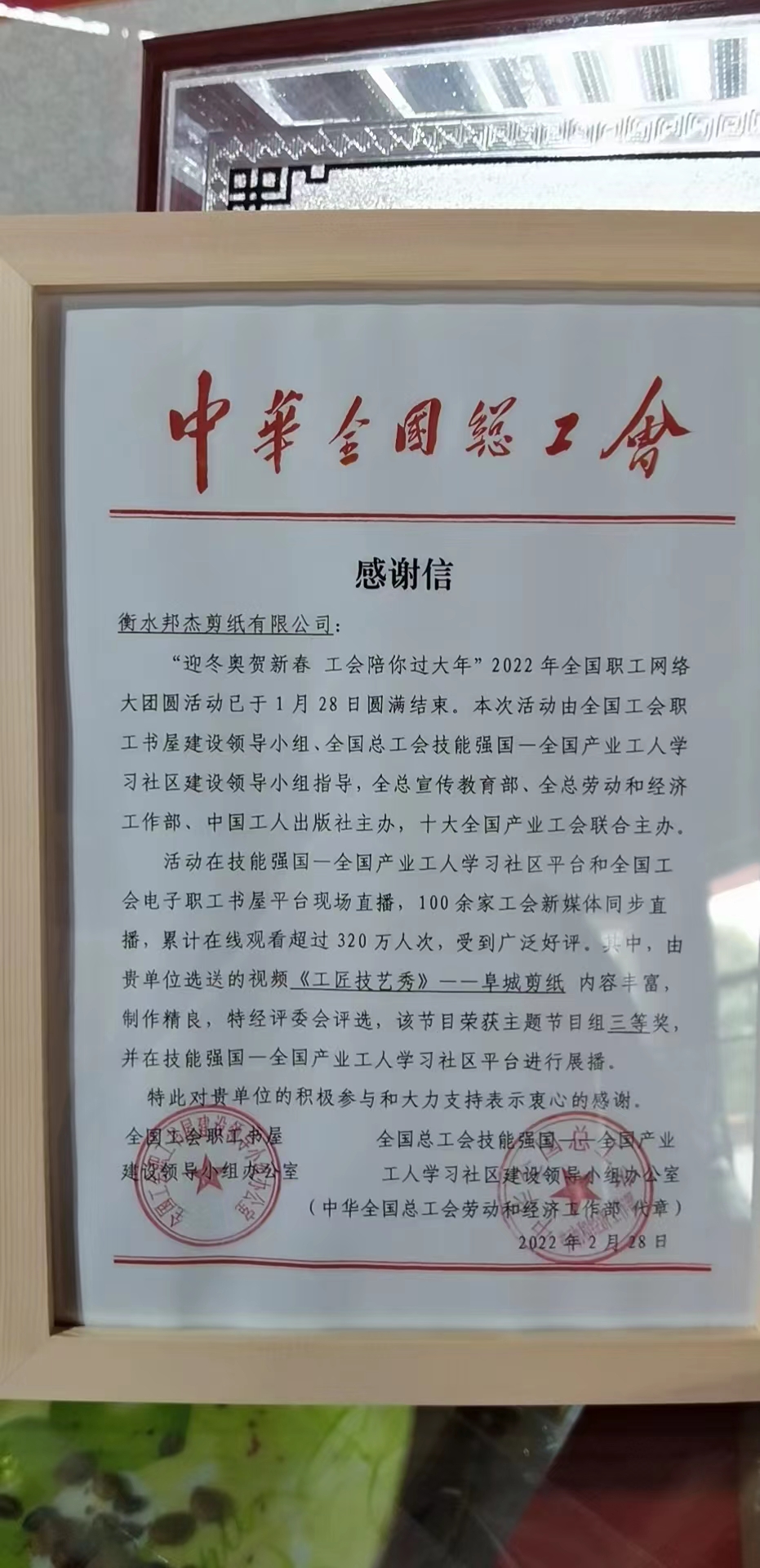 日前,中华全国总工会发给衡水邦杰剪纸有限公司感谢信,称由阜城县总工会选送的视频《工匠技艺秀》——阜城剪纸节目,在“迎冬奥贺新春,工会陪你过大年”2022年全国职工网络大团圆活动中荣获三等奖。