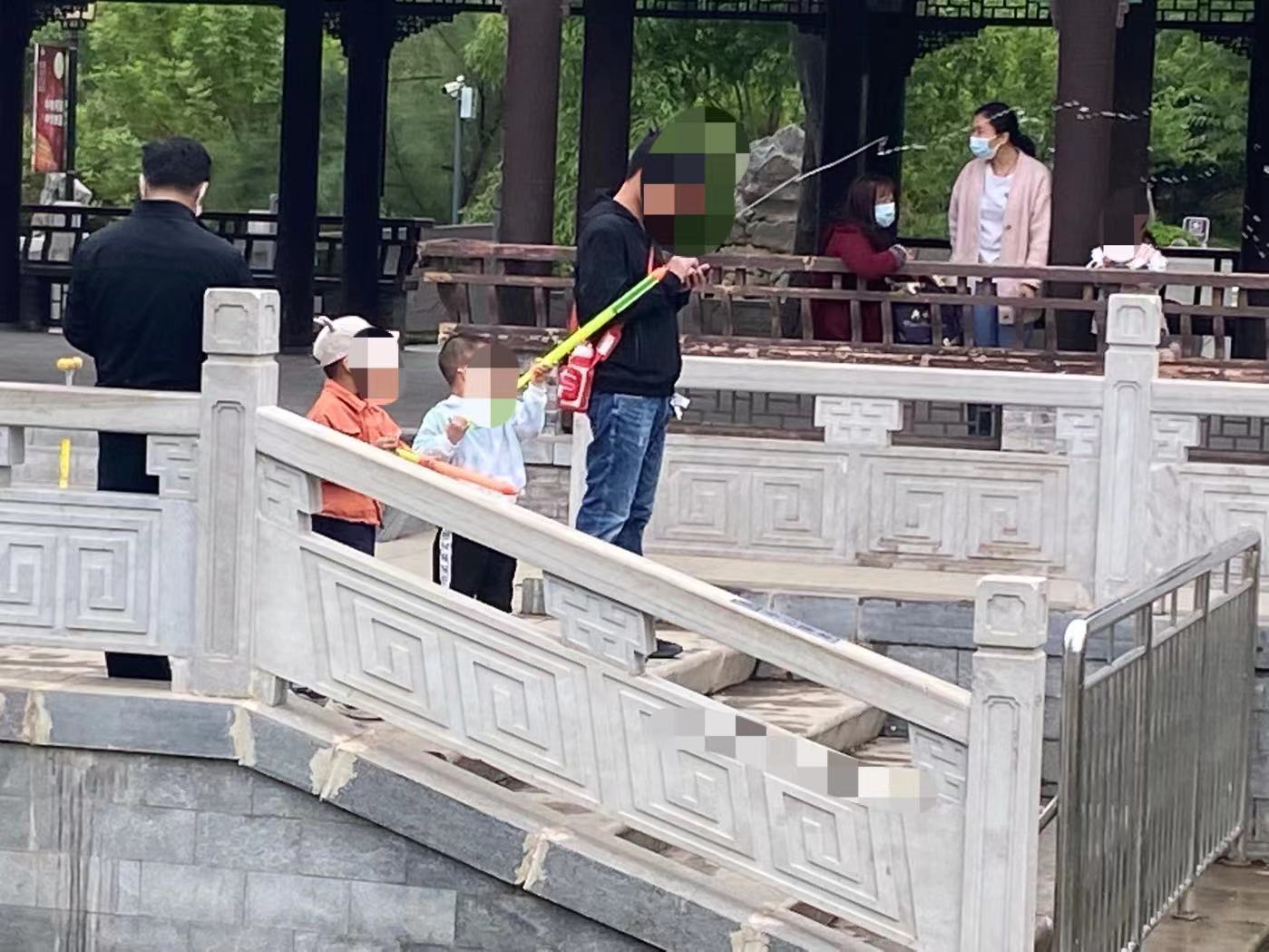 记者看到,不少孩童拿着水枪,在池里吸水后像天空中喷射,根本不担心掉下去或者水喷到别人;还有孩子拿着捞网,站在水池边捞着小鱼和水草,玩得不亦乐乎。这些孩子大的十几岁,小的才四五岁。仅有几名家长一直跟在孩子身边,有的家长陪着孩子一起玩水,有的家长在一边玩着手机,有的聚在一起聊天,视线都不在孩子身上。