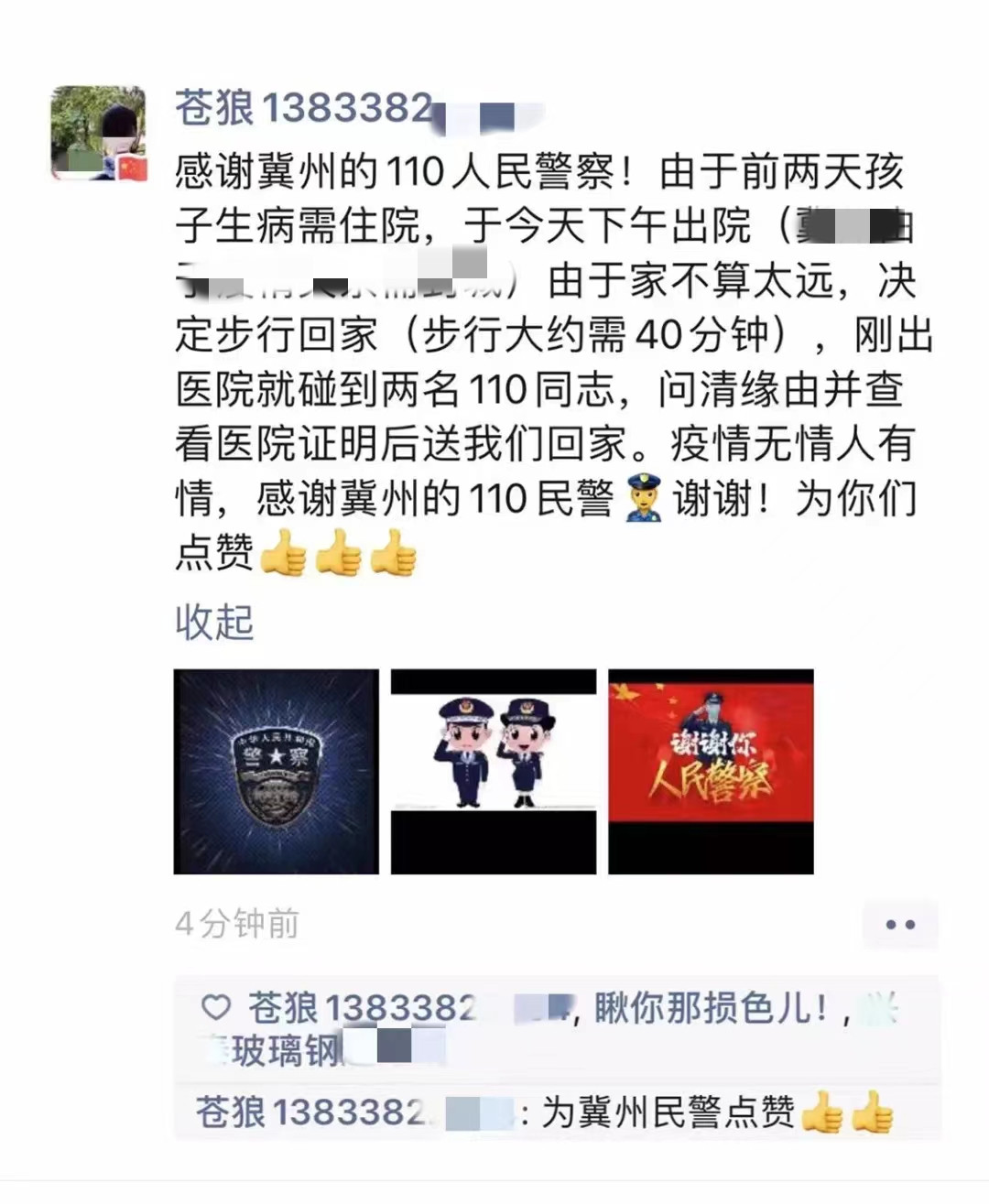 4月28日,一条感谢冀州区公安局民警的信息在朋友圈广泛转发,网友用真切淳朴的话语讲述了孩子出院,得到冀州区公安局民警热心帮助的事情。广大网友为民警行为点赞的同时,还通过多方打听,确定了两位热心民警的身份——他们便是冀州区公安局刑警二中队民警徐天、李春蕾。