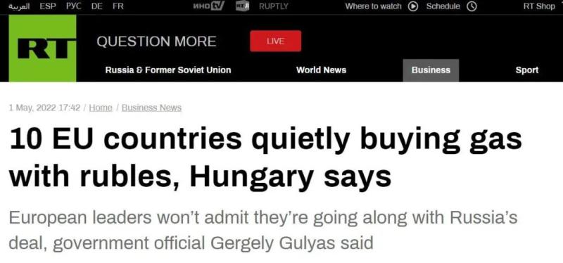 RT称,目前尚不清楚古亚什指的是哪9个欧盟国家。但在波兰和保加利亚拒绝用卢布支付后,俄罗斯天然气工业股份公司已经停止了对这两个国家的供气,但彭博社日前(4月27日)报道显示,正如古亚什所说,欧盟的10个成员国已经在俄罗斯天然气工业银行开户,而且有4个国家实际上已经用这种机制支付了俄罗斯天然气。