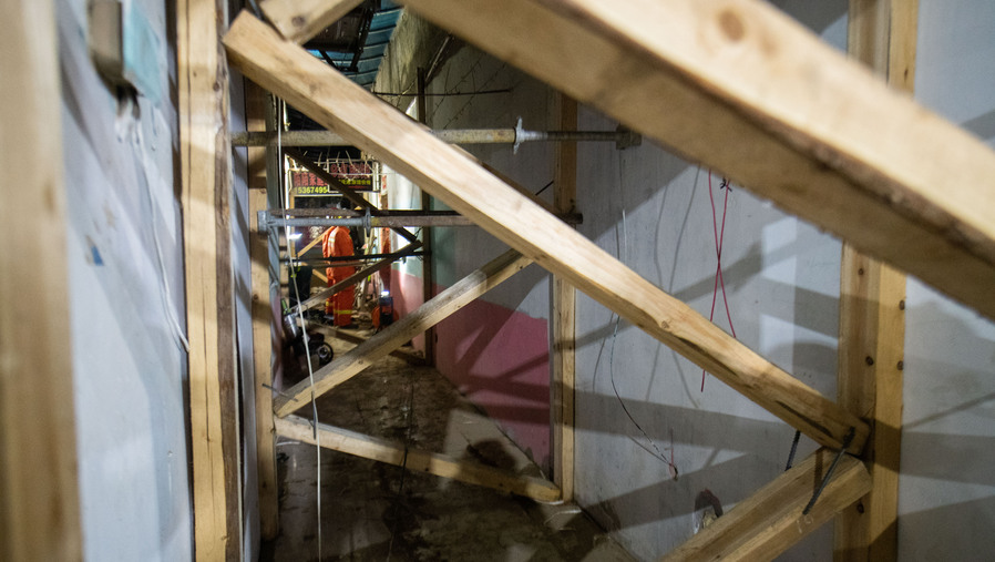 记者看到,救援现场布满了加固用的木条与钢筋。确定这名女性被困者后,救援人员打通了一个直径约75厘米的生命通道,一次仅容一两人弯腰通过,大型设备无法进入。