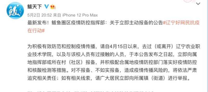 5月2日,辽宁营口市鲅鱼圈区新冠肺炎疫情防控指挥部发布通告,请自4月15日以来,去过(或离开)辽宁农业职业技术学院,以及与该校人员有过接触的人员,于公告发布之日起,立即向属地指挥部或所在村(社区)报备,并积极配合属地疫情防控部门落实好疫情防控和核酸检测等措施。