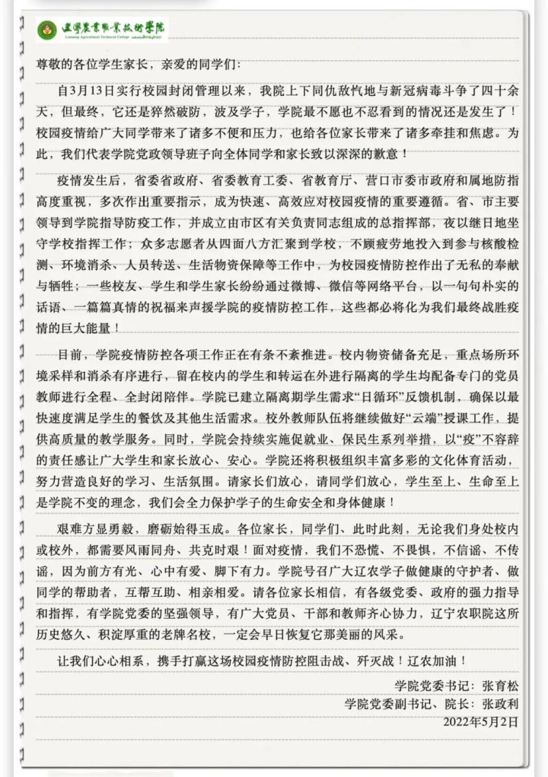 3日下午,辽宁农业职业技术学院官方网站和微信公众号发布了《致全体同学和家长的一封信》,信中写道,自3月13日实行校园封闭管理以来,学校上下与新冠病毒斗争了四十余天,但最终还是破防波及学子。目前校内物资储备充足,重点场所环境采样和消杀有序进行,留在校内的学生和转运在外进行隔离的学生,均配备专门的党员教师进行全程、全封闭陪伴。