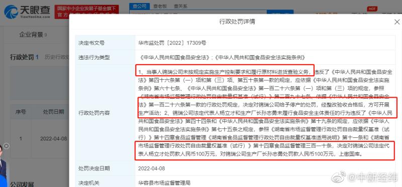 天眼查App显示,近日,湖南锦瑞食品有限公司因未按规定实施生产控制要求和履行原材料进货查验义务,被华容县市场监督管理局给予停产的处罚,经整改验收合格后,方可开展生产活动;锦瑞公司法定代表人杨立才和生产厂长孙志勇因未履行食品安全主体责任,被分别罚款100万元。据悉,此前央视3•15晚会曝光,插旗菜业、锦瑞食品在内的多家酱菜生产企业存在收购“土坑酸菜”、生产环境恶劣等严重影响食品安全的行为。