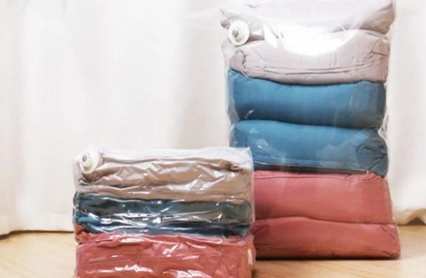 除了将衣服收纳在抽屉或柜子中,还可以用真空收纳袋收纳。将衣服折叠完成之后,整齐的放置于收纳袋内,之后将收纳袋封口,抽出里面的空气,这时你会发现衣服体积大大缩小,再将它放置于衣柜内,可以节省许多空间。而且用这种方式收纳衣服也有一个好处,那就是可以隔绝衣服与空气接触,这样收纳的衣服不怕变得潮湿、滋生细菌。