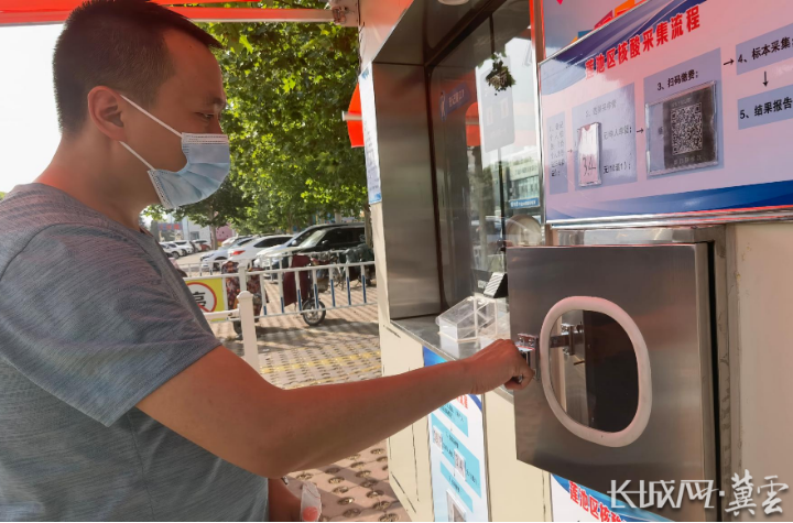采集完核酸之后,居民将采样管放入洁净传递窗。 长城网·冀云客户端记者 李慧英 摄