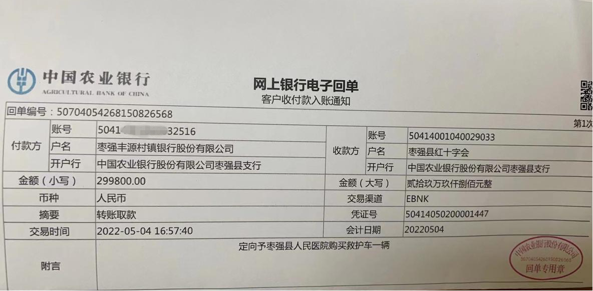 5月4日,枣强丰源村镇银行将29.98万元爱心资金汇到县红十字会,积极履行社会职责,为打赢疫情防控阻击战贡献金融力量。据了解,这是枣强县红十字会目前接收的最大一笔企业资金捐赠。