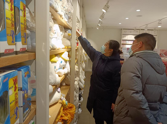 香河县市场监督管理局知识产权管理保护股执法人员检查玩具店售卖冰墩墩、雪融融现场。 何立忠摄