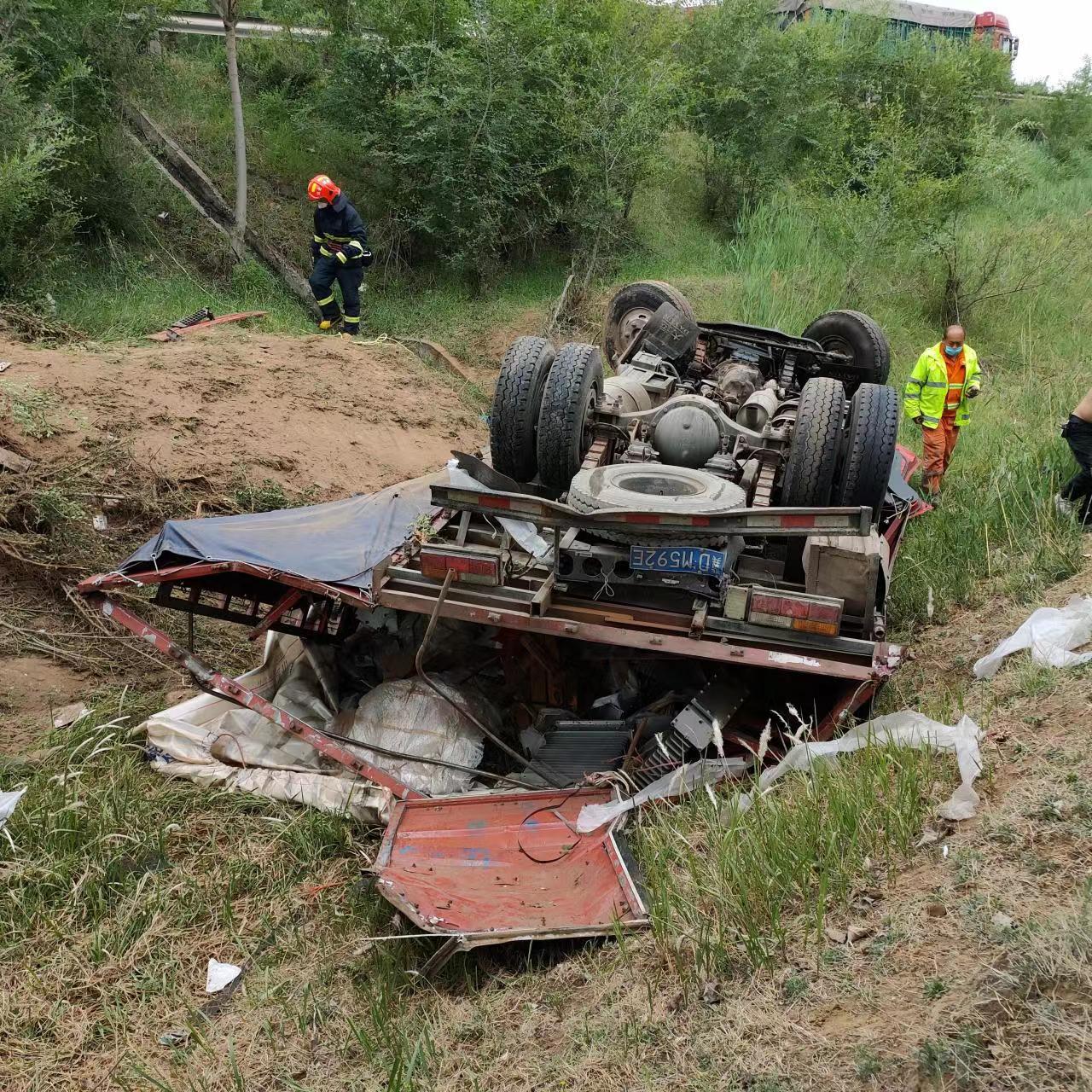 消防指战员到达现场后,通过勘察和询问得知,由于雨天路滑,货车操作不当撞开高速防护栏后滑出约20米,翻倒在路边沟中。由于下雨土壤湿滑,加上冲击力大,车头部分已经陷入泥土中,驾驶室严重变形,驾驶员身体被牢牢卡住,无法逃脱。