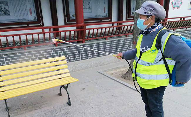 环卫工人正在对公园内的公共设施进行消毒。景县融媒体中心供图