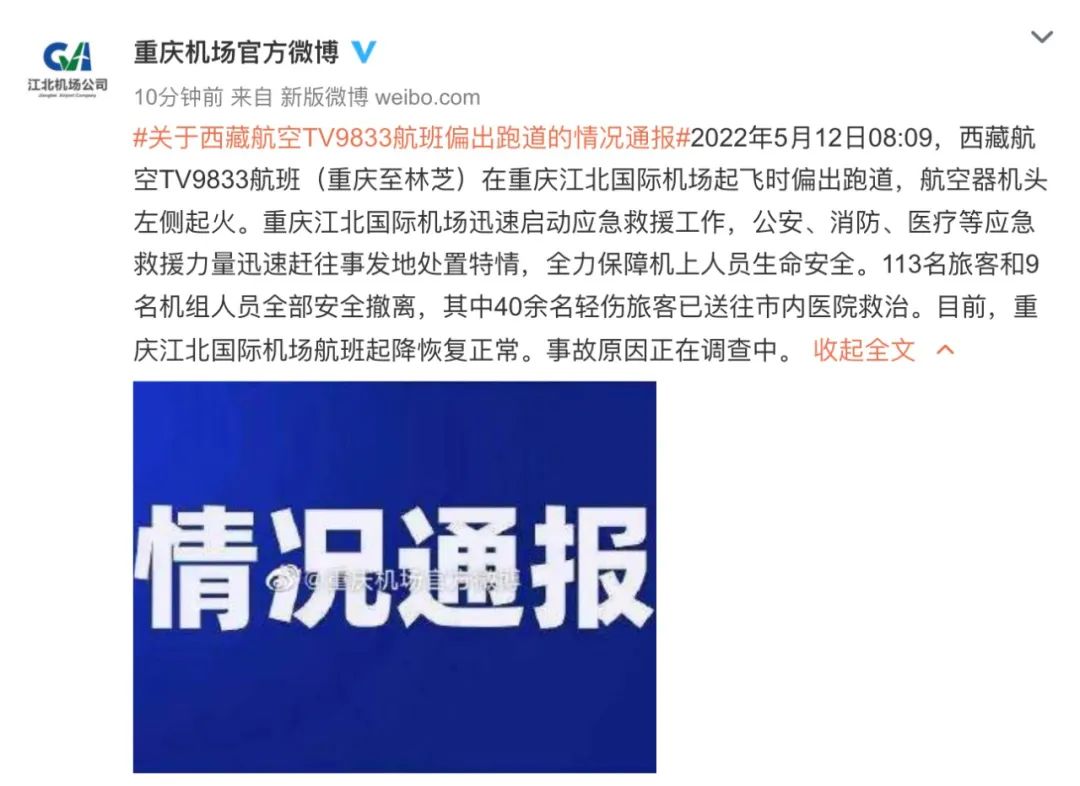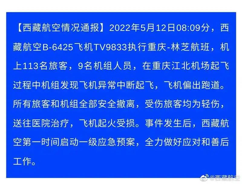 据西藏航空通报:5月12日08:09分,西藏航空B-6425飞机TV9833执行重庆—林芝航班,机上113名旅客,9名机组人员,在重庆江北机场起飞过程中机组发现飞机异常中断起飞,飞机偏出跑道。所有旅客和机组全部安全撤离,受伤旅客均为轻伤,送往医院治疗,飞机起火受损。事件发生后,西藏航空第一时间启动一级应急预案,全力做好应对和善后工作。