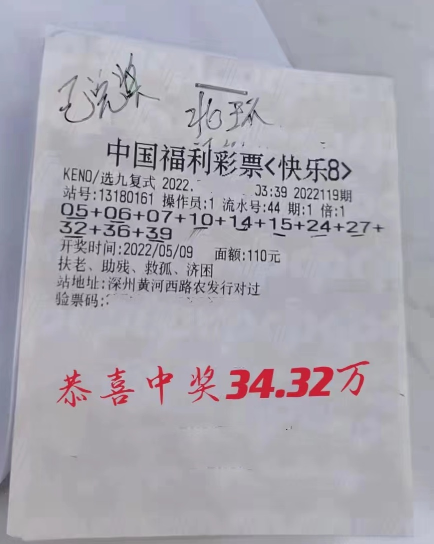 记者注意到中奖彩票是一张11码选九复式票,花费110元,中了快乐8“选九中九”1注,加上18注“选九中八”和36注“选九中七”,奖金共计34.32万元。