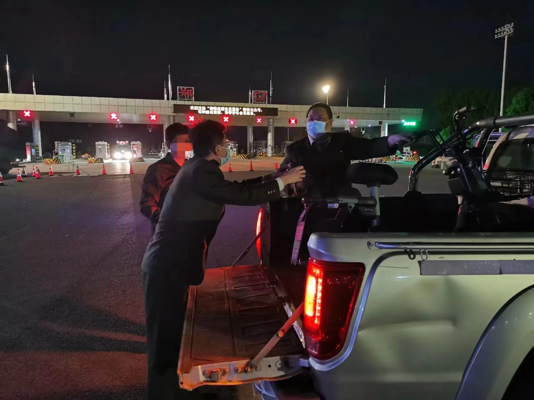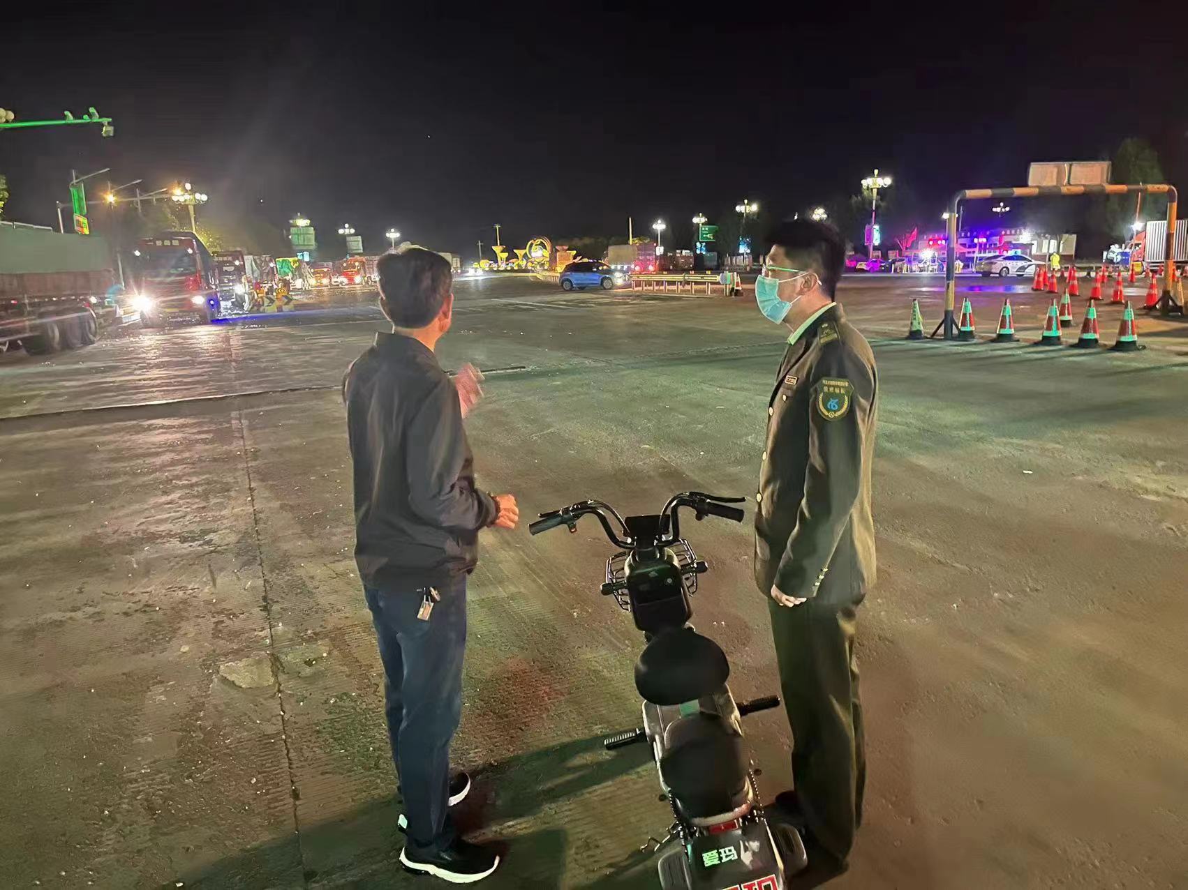 “大爷,这大晚上的您怎么来这里了,骑电车不能上高速,太危险了!”当天晚上11时许,郑口收费站值班人员刘杨巡查广场时,发现一名老人骑着电动车正要上高速,赶忙上前进行劝阻。刘杨扶着老人来到安全区域后,在交谈中发现老人精神恍惚,语无伦次,根本听不进劝阻。见此情况,刘杨及时上报,值班站长张世佳带领工作人员立即赶到了现场。