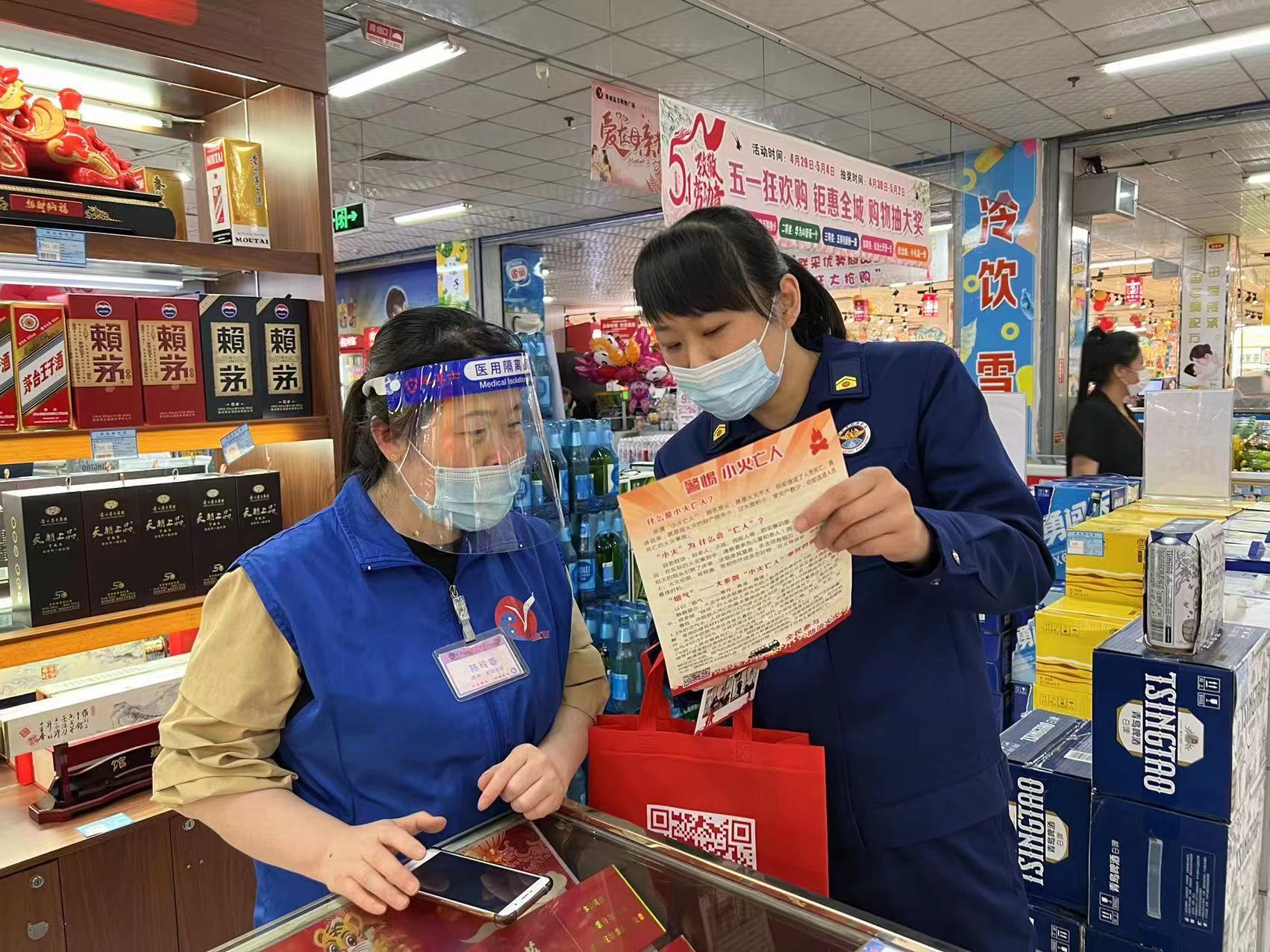 阜城县消防救援大队宣传员在小区超市为售货员讲解防灾减灾知识。郝红军 摄