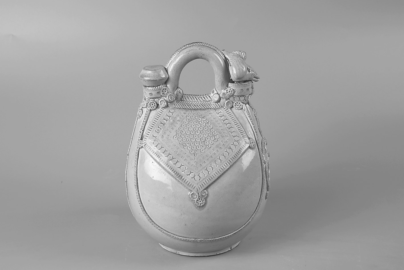 1996年故城县出土,拱形提梁,短流,凤首形壶盖与壶身为分体式;扁圆形垂腹,饼形足;通体施白釉,釉色白中泛青,釉面平整光润;壶腹前后上部贴塑对称的鞯缛图案及璎珞仿皮囊缝合纹;其上饰花朵纹和戳印纹。为唐代邢窑精品;高24厘米、底径10.3厘米;皮囊形制具有北方游牧民族的典型特征,这件瓷器反应了北方游牧民族与汉文化的融合;同类别藏品目前全国发现4件,这是保存最完好的一件,为馆藏一级文物。