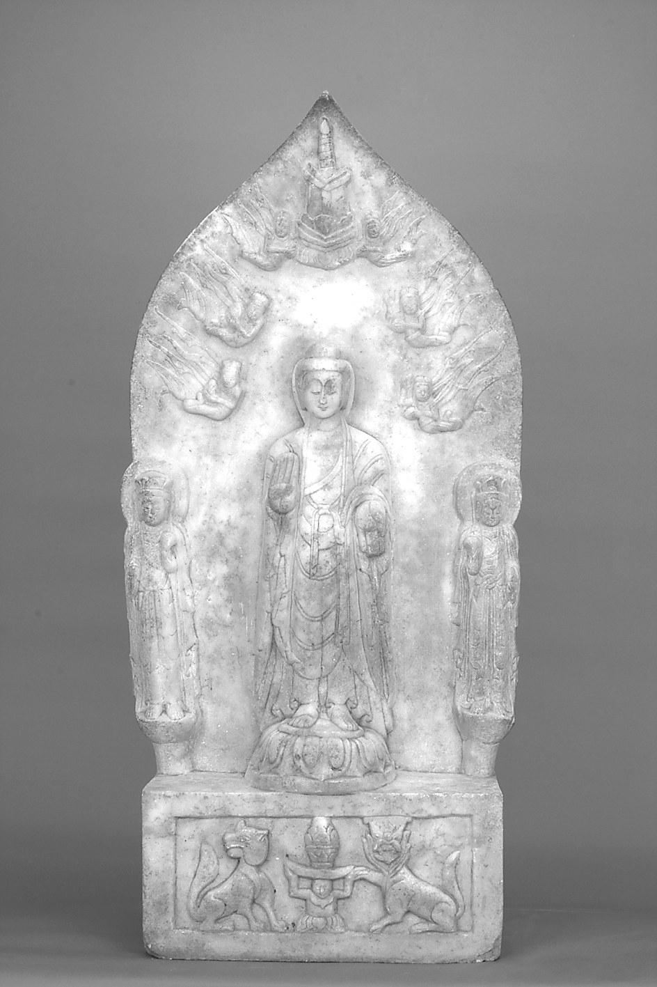 1984年武邑县袁小寨出土,汉白玉材质,通高85厘米、宽41.5厘米,由舟形背光、佛像及方形座三部分组合而成。背光上浮雕飞天、宝塔,主佛居中,头饰高发髻,身着袈裟,双手施无畏与愿印,跣足立于覆莲之上。二菩萨端立于佛两侧,头戴花冠,身披薄衣,足下蹬莲蓬圆座。底座为长方形,正面刻有一力士双手托莲蓬,两侧各刻有一护佛瑞兽。基座背面、侧面刻有16行共103字的供养人题记。为馆藏一级文物。