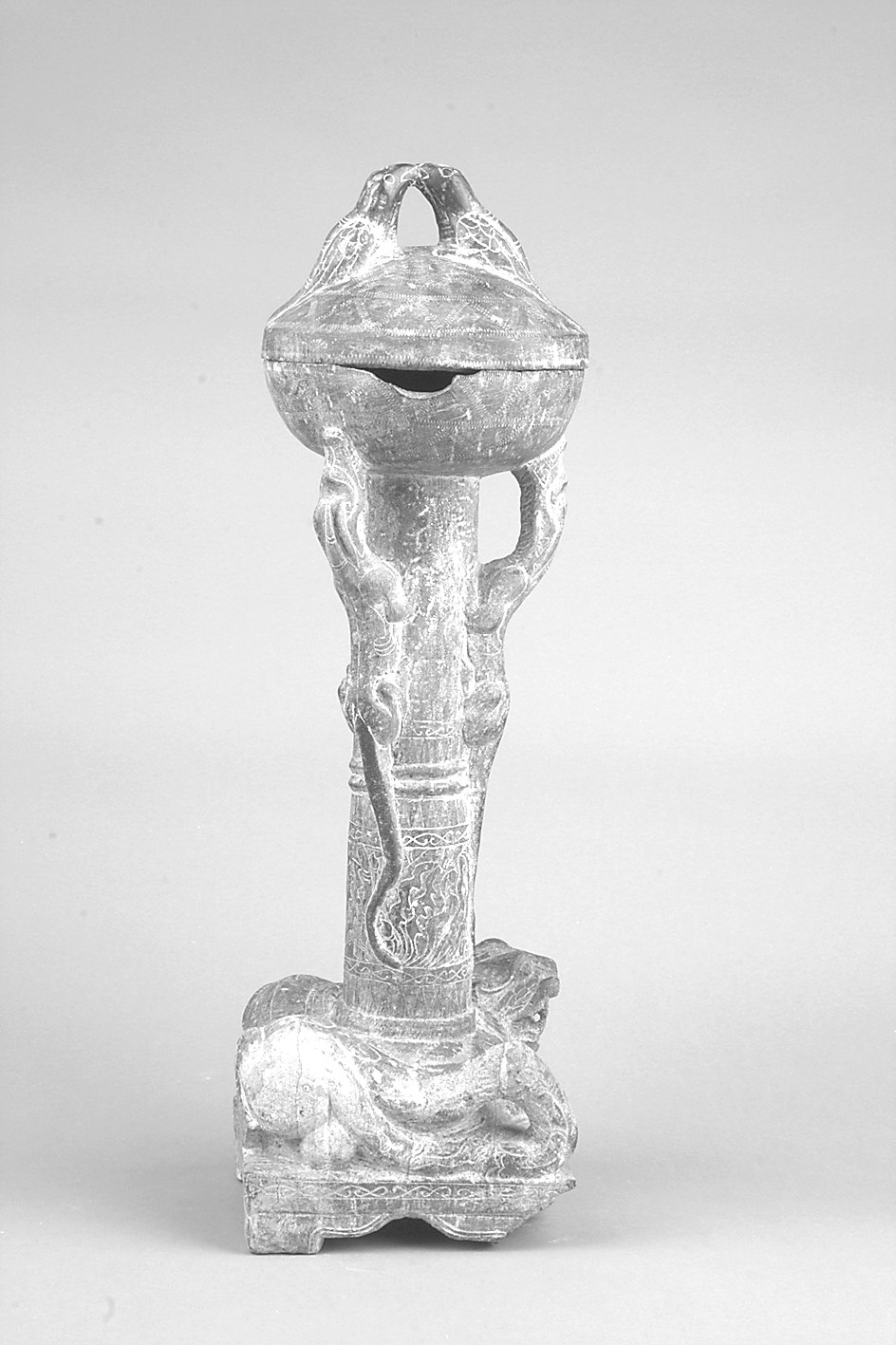 1978年冀州前冢汉墓出土。该器由豆盖、豆盘、豆柄及底座组成。豆盖上部由两只嘴部相连作亲吻状的鸟状盖纽;豆盖外缘刻画几何纹一周;豆盘外缘刻画S纹饰;豆柄上浮雕三只仰卧昂首垂尾的虎形兽,三兽以吻承托豆盘,底纹为波浪形S纹、锯齿纹、凸弦纹和忍冬纹。底座为正方形举行足,座上浮雕有一只呈俯卧状的虎形兽,瞠目张口,四肢用力支撑所驮负的豆柄,生动逼真。通高46.5厘米,底座边长14.5厘米。为馆藏一级文物。