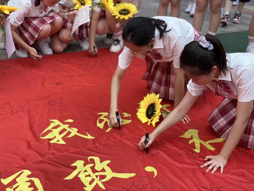 临近中考,重庆市珊瑚中学的初三学生在励志标语上签名。(受访者供图)