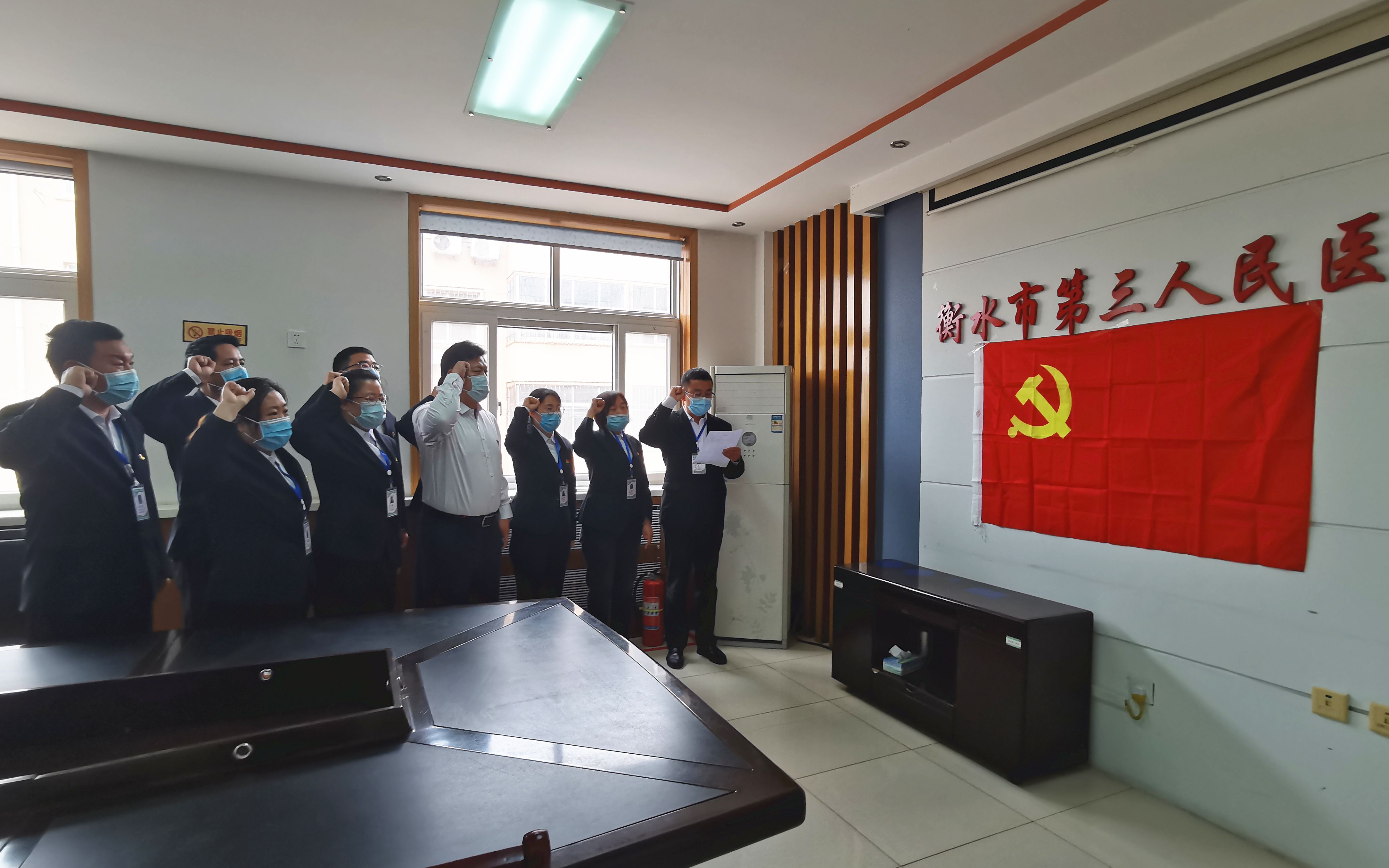 各临时党支部按照党总支要求第一时间召开了临时党支部第一次支部党员大会,各党支部根据工作岗位和承担的具体任务合理划分了党小组。根据疫情防控要求,各临时党支部以党小组的形式传达了《中共衡水市第三人民医院党总支委员会关于组建抗击疫情临时党支部的决定》,共同学习《中共衡水市第三人民医院党总支委员会关于‘战疫’一线临时党支部工作实施方案》,并组织小组党员向党旗庄重宣誓,表明抗疫决心。医院党总支委员会成员以普通党员身份参加了所在临时党小组活动,院党总支作为抗疫工作中不停摆的“大脑中枢”迅速运转起来。