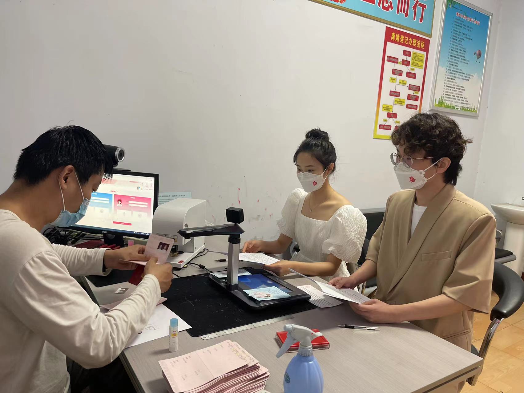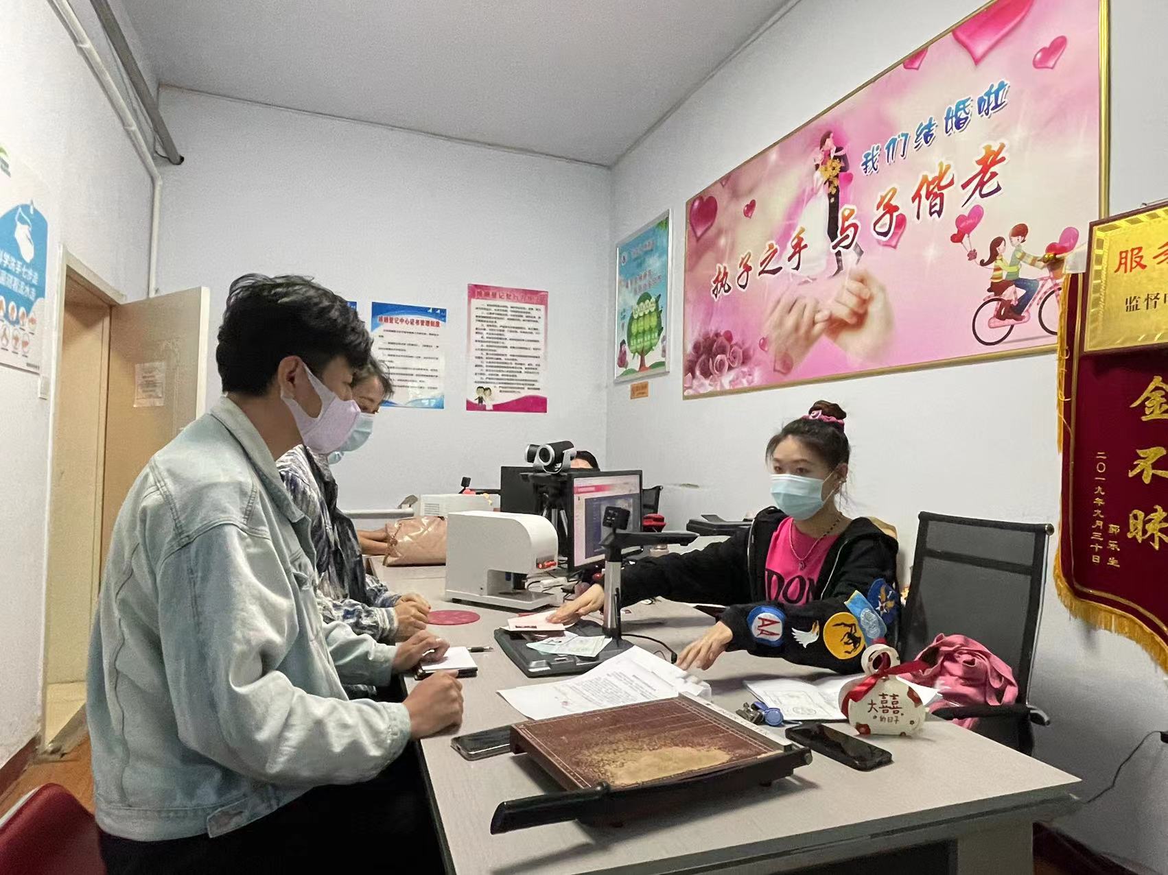 在登记大厅内,经过检验证件、填写表格等手续后,工作人员按下钢印,将大红的结婚证交到新人手中,一对对新人小心翼翼地接过象征爱情的“证书”,并手拿着证书拍照记录下这难忘而甜美的时刻。
