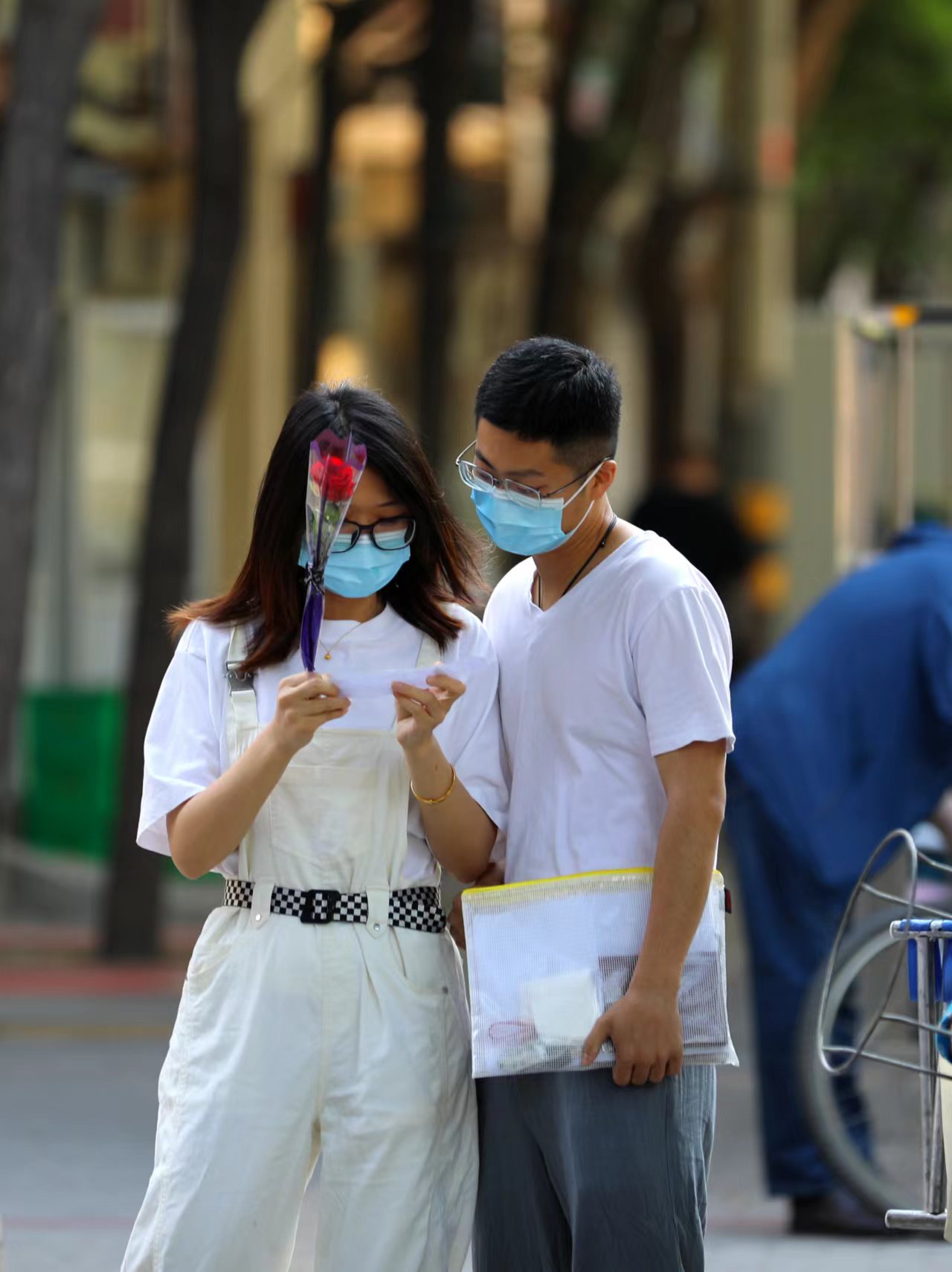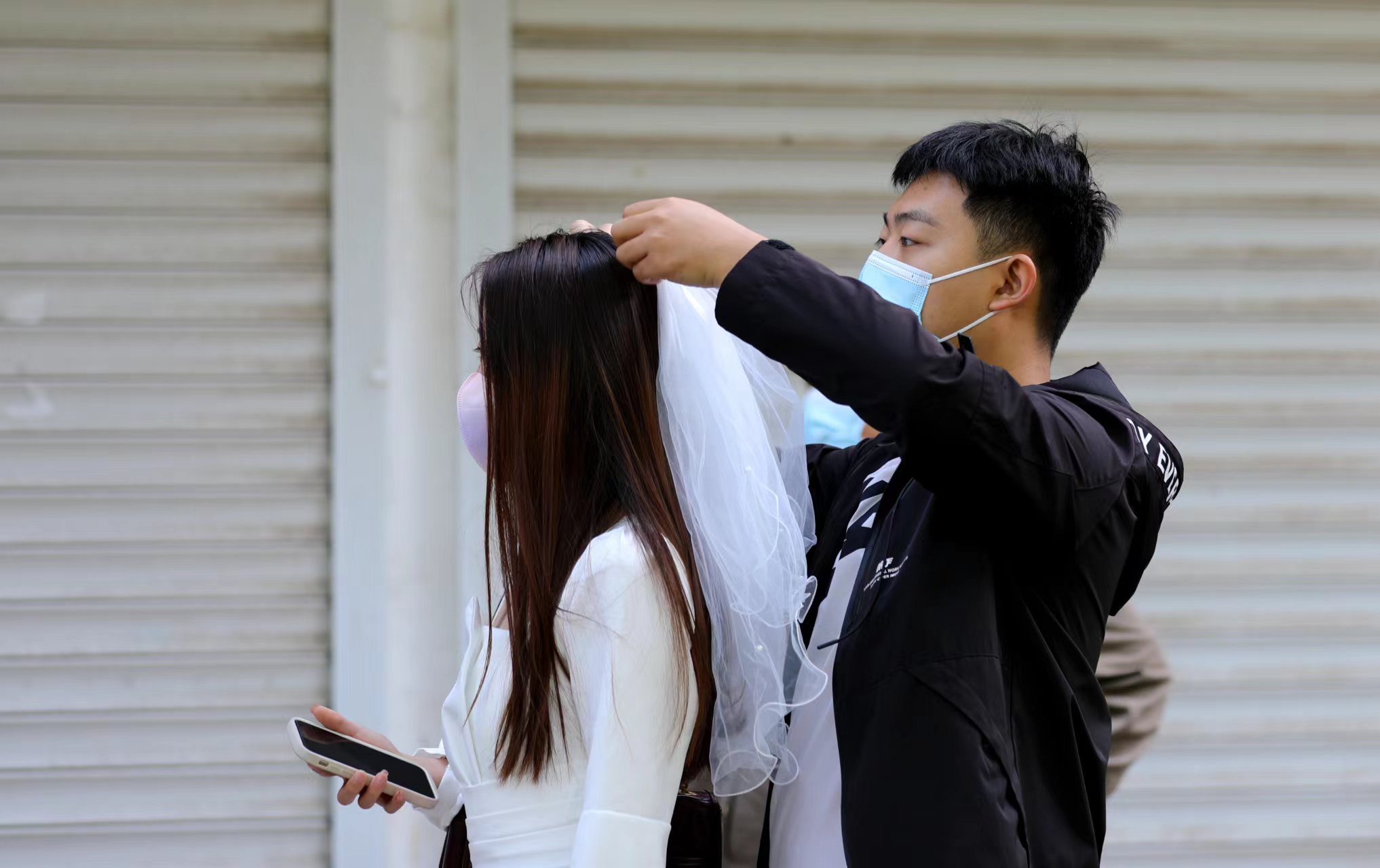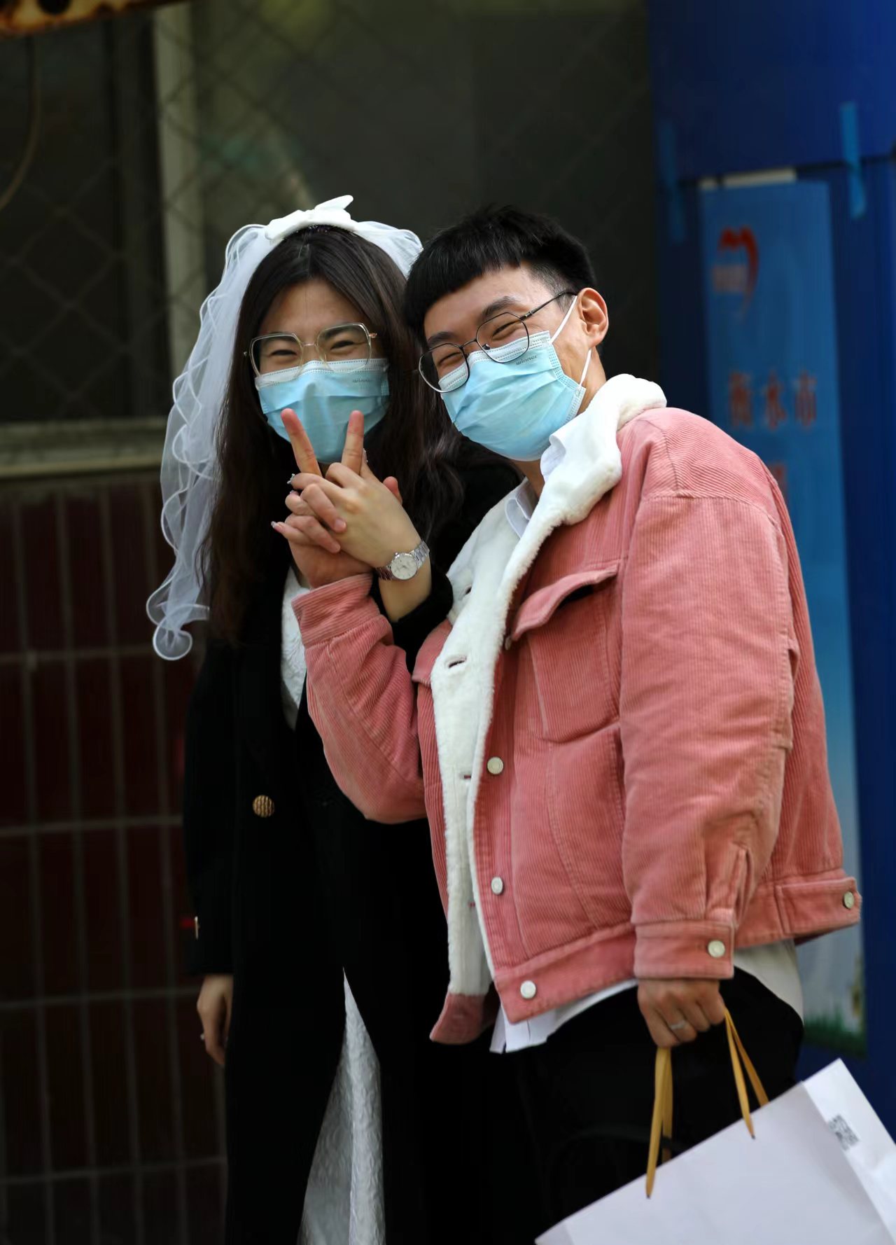 当天早晨7时许,记者看到,在婚姻登记处门前等待结婚登记的准新人们戴好口罩,在现场工作人员的引导下,有序排队等待进入登记处。男孩儿们穿戴整齐、精神抖擞,女孩儿们则经过了一番精心打扮,有的穿上了白色长裙,头上戴着简易白色头纱,有的则穿着旗袍,手捧着男朋友送上的花束,有的小情侣则穿着精心准备的情侣装手拉着手依偎在一起。