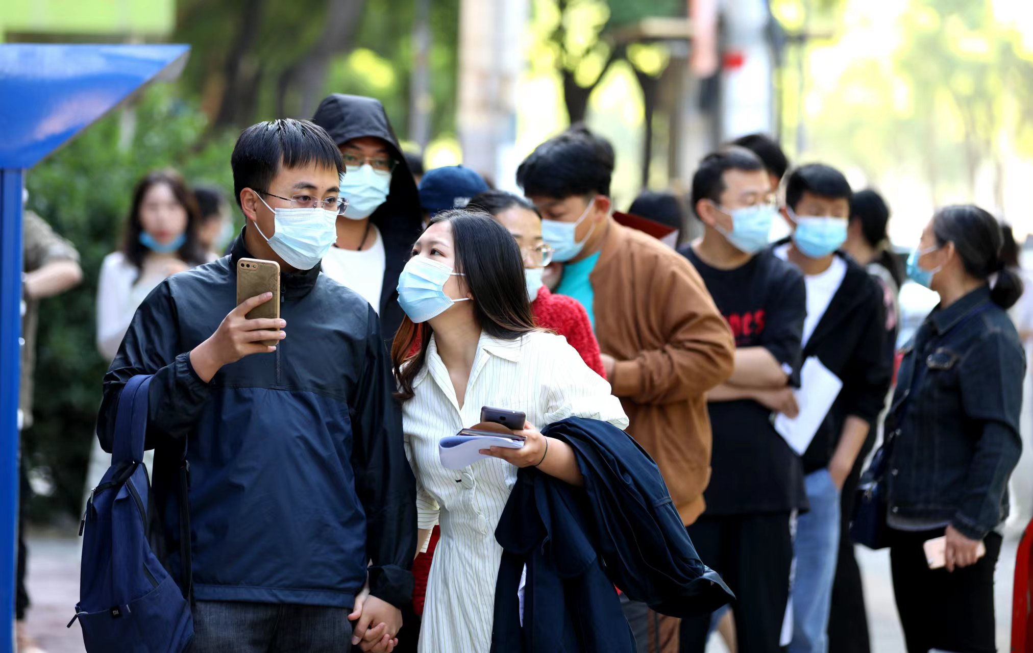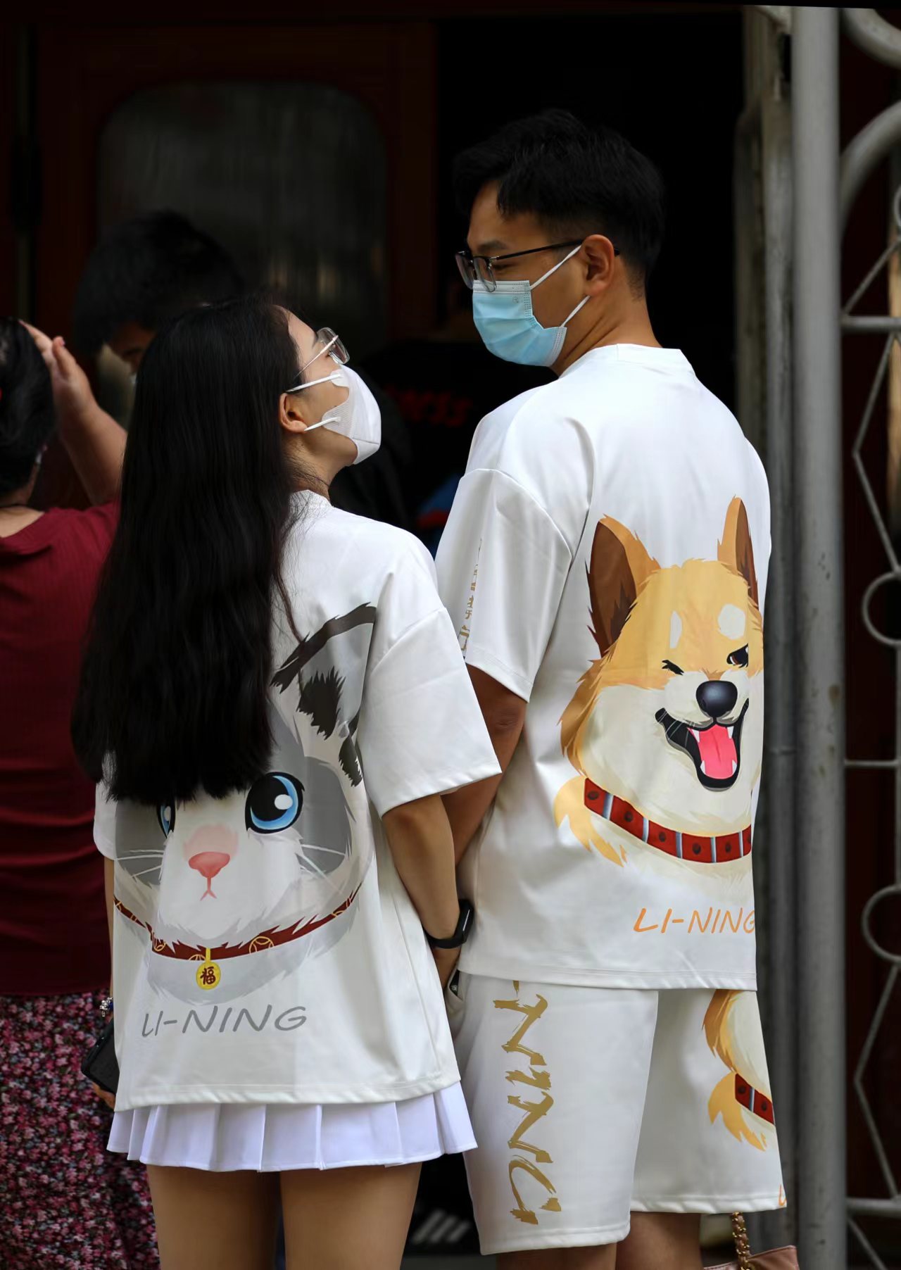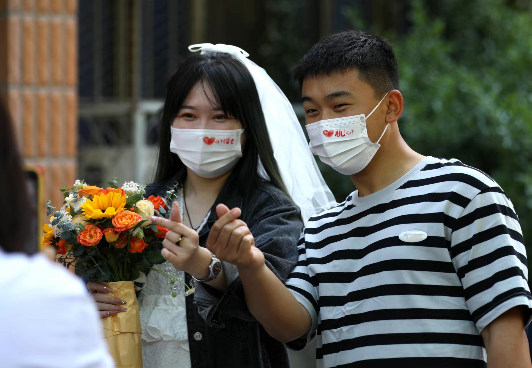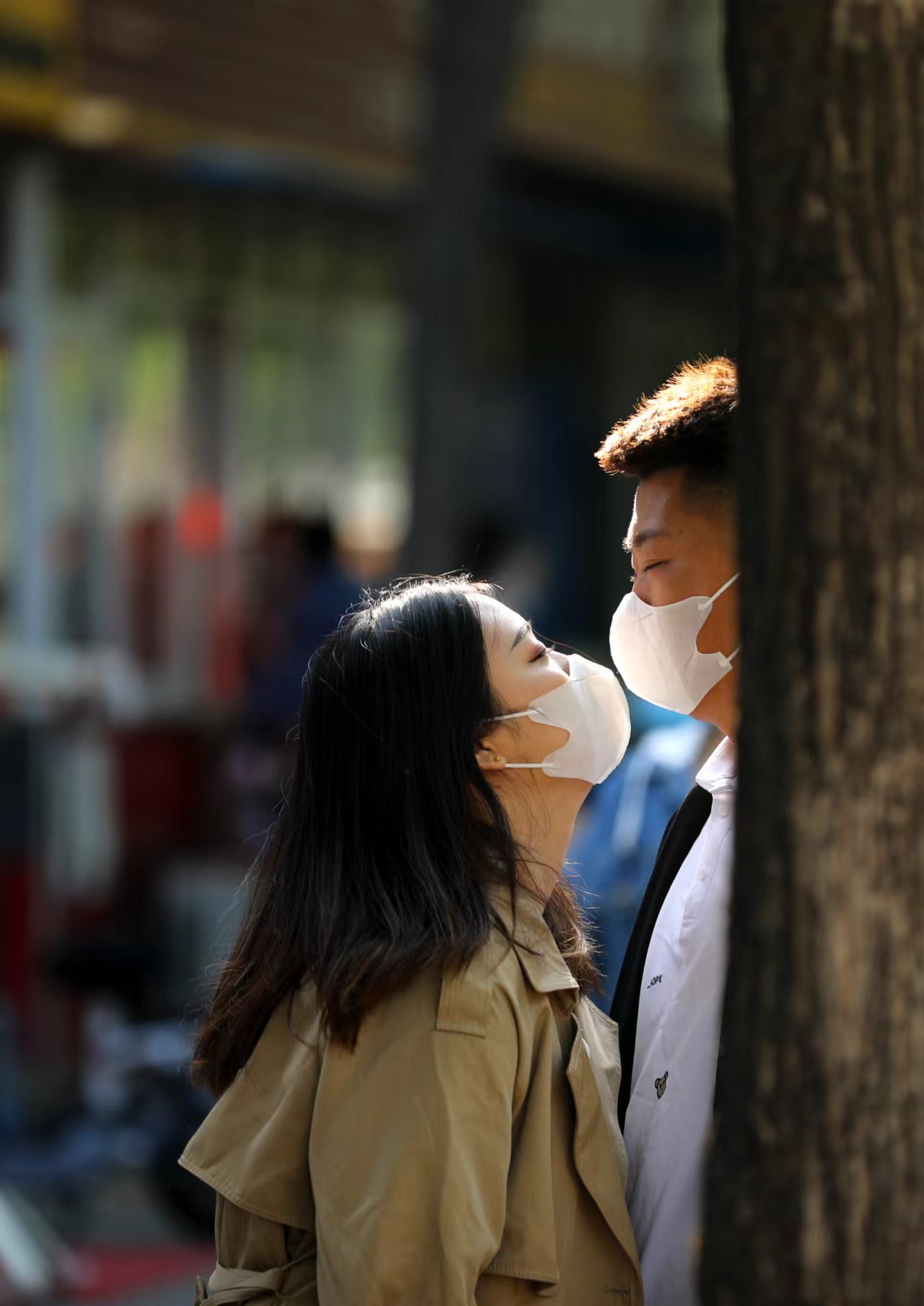 当天早晨7时许,记者看到,在婚姻登记处门前等待结婚登记的准新人们戴好口罩,在现场工作人员的引导下,有序排队等待进入登记处。男孩儿们穿戴整齐、精神抖擞,女孩儿们则经过了一番精心打扮,有的穿上了白色长裙,头上戴着简易白色头纱,有的则穿着旗袍,手捧着男朋友送上的花束,有的小情侣则穿着精心准备的情侣装手拉着手依偎在一起。