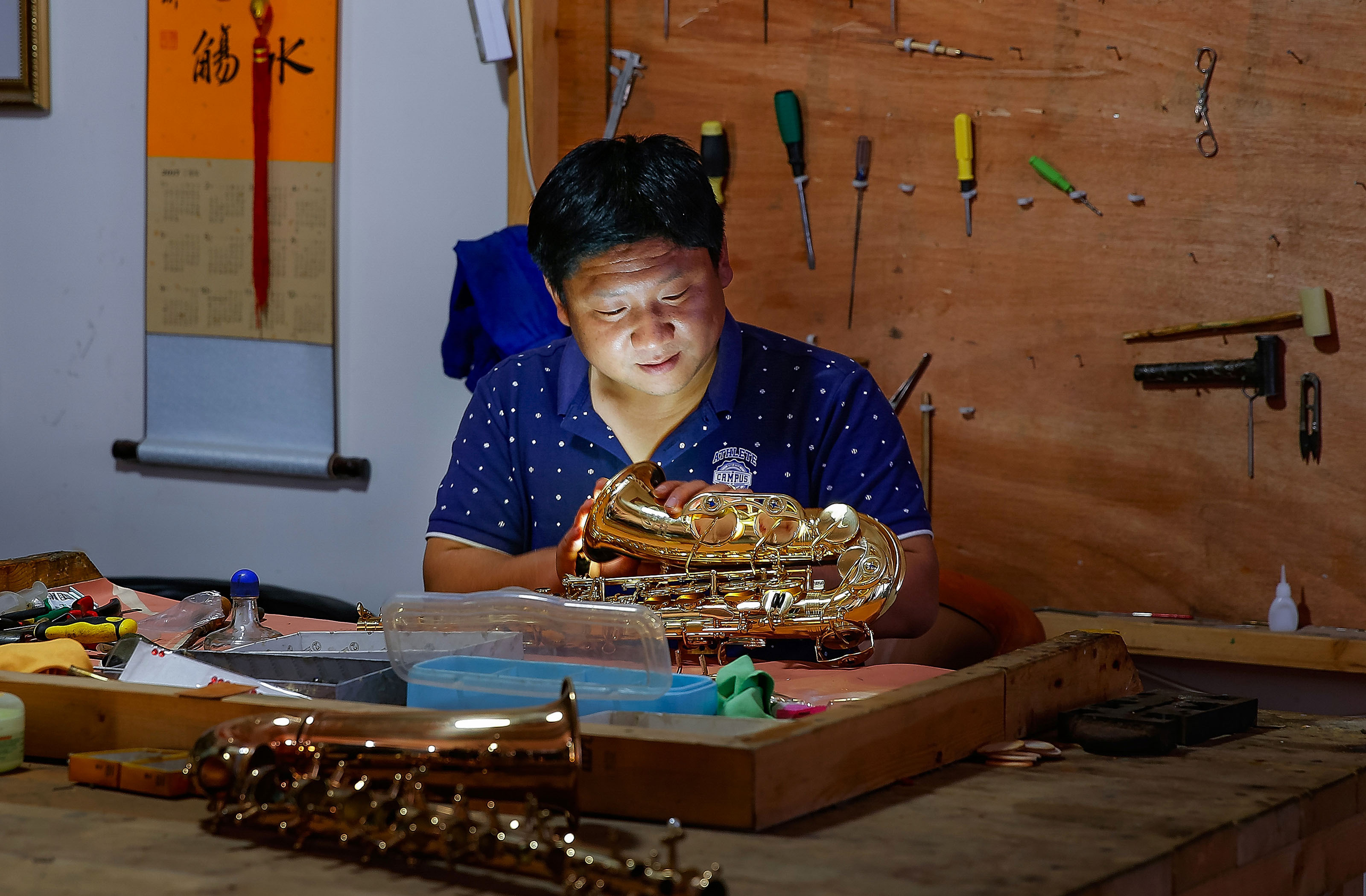 “网红”萨克斯技师周卫仓在制作乐器。郭永杰 摄