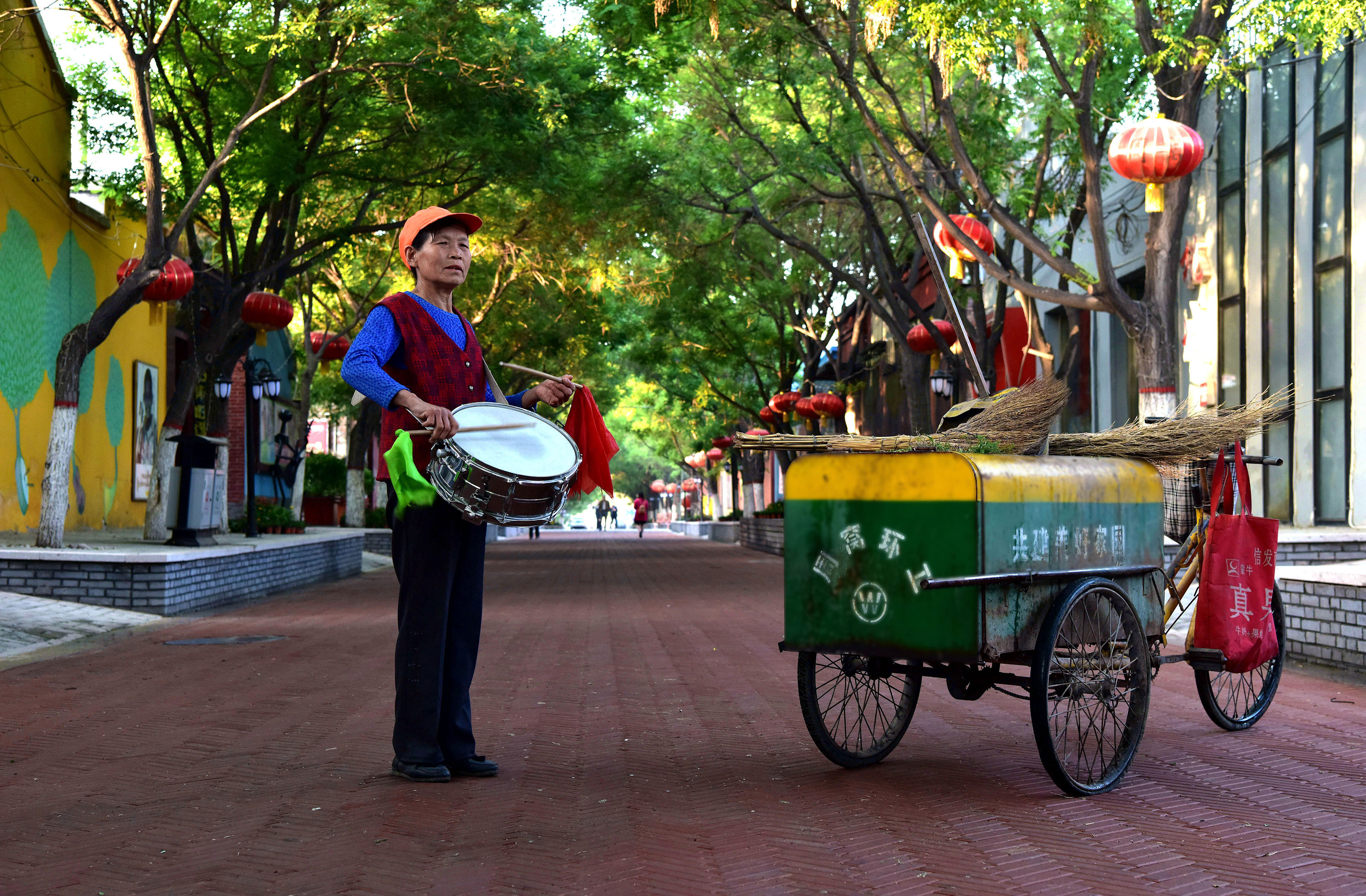 周窝音乐小镇的保洁员在劳动间隙演奏乐器。郭永杰 摄