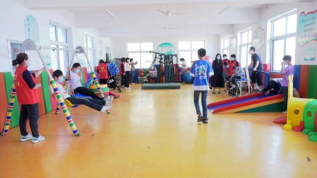 在县特殊教育学校的康复训练室里,欢声笑语,其乐融融。志愿者们在老师的帮助下,和这里的孩子们一起做游戏,进行互动表演,孩子们由拘谨逐渐变得放松,慢慢融入其中,脸上洋溢着快乐和满足。
