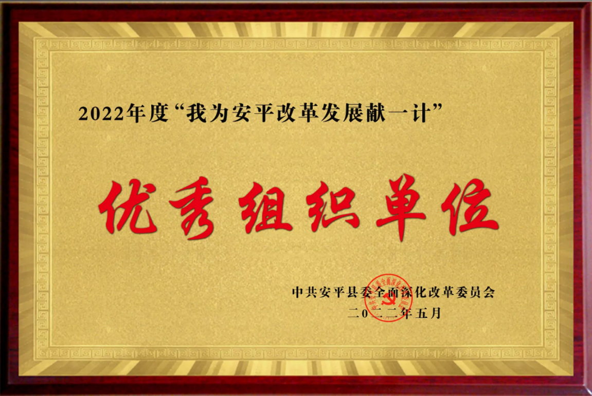 近日,农行衡水安平支行被中共安平县委全面深化改革委员会授予2022年度“我为安平改革发展献一计”优秀组织单位荣誉称号,该支行是全县金融系统唯一获奖单位。