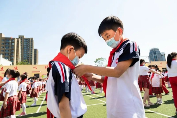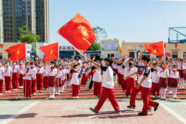 星星火炬,代代相传,红旗一角,鲜艳荣光。在“六一”国际儿童节到来之际,迎宾路小学举行了“童心向党 红领巾喜迎二十大”新生入队仪式。在阳光的照耀下,胸前的红领巾熠熠生辉,一颗红色的种子在孩子们心中生根发芽。