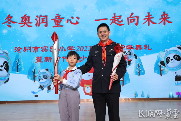 沧州市实验小学学生李旭尧(左)和刘亚斌互换火炬合影。通讯员 张在朋 摄