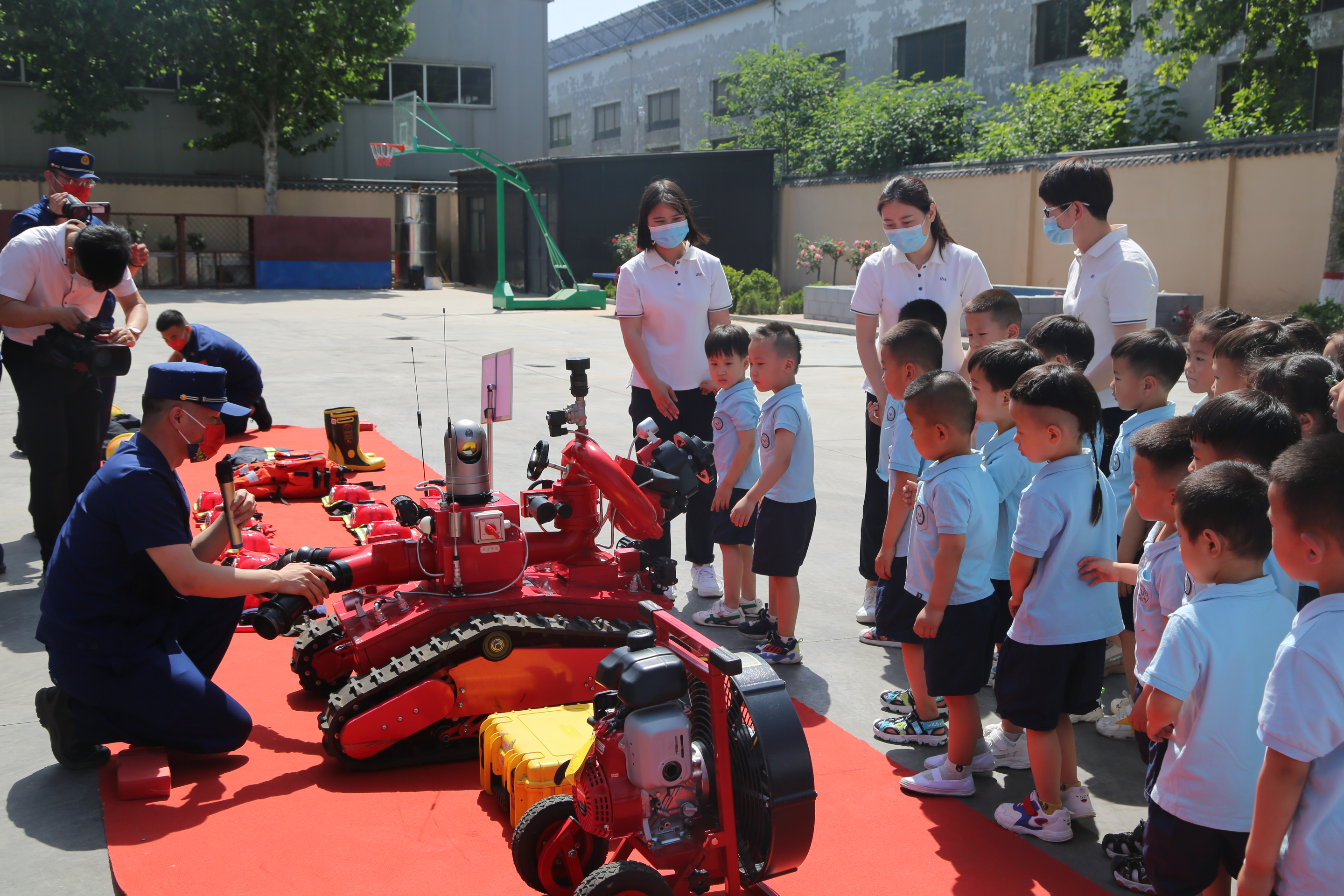指战员还为师生们讲解了消防装备器材的用途和使用方法以及基本的灭火知识和自救常识,现场示范了战斗服着装,同时邀请师生们亲自上身体验做“消防员”的感觉。随后,指战员带领师生们参观了战斗班宿舍,孩子们被消防员叔叔整齐划一的内务所叹服,并现场学习了“豆腐块”被子的叠法,整洁、自律的种子在他们的惊叹声和掌声中萌发。