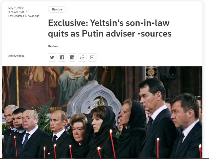 据路透社30日援引消息人士报道,俄罗斯前领导人叶利钦的女婿瓦连京·尤马舍夫宣布辞去总统顾问一职,但辞职原因暂不明确。