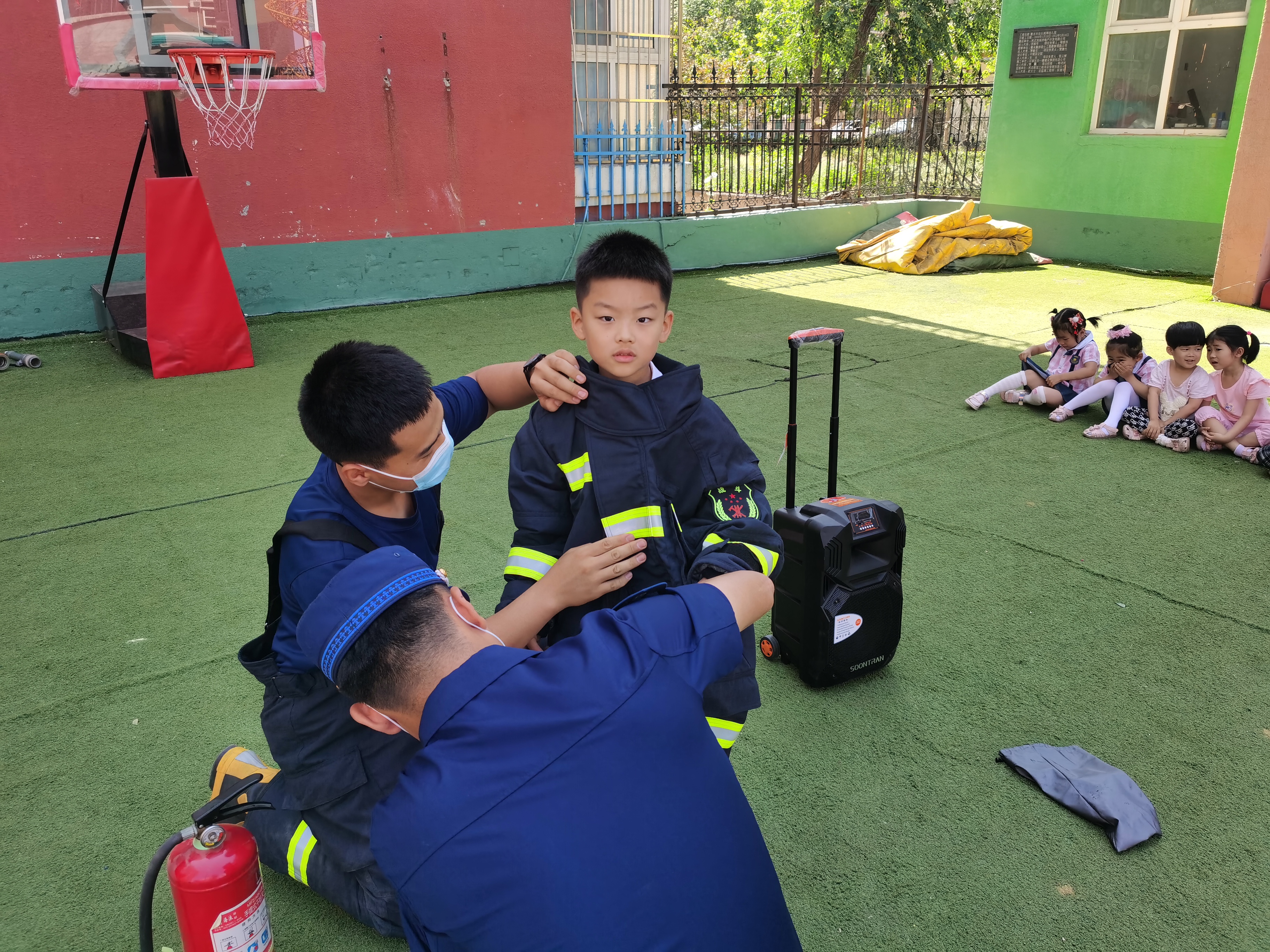 逃生演练结束后,在“消防车辆器材展区”,小朋友们围着各种不同的消防器材,向大队宣教员了解各种不同器材的用途和性能等。小朋友们还穿上灭火战斗服,化身“小小消防员”体验了一次“灭火战斗”。