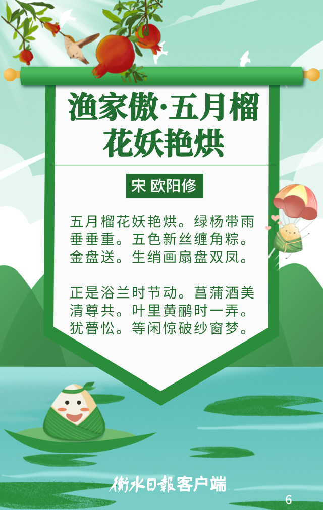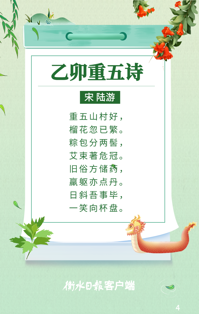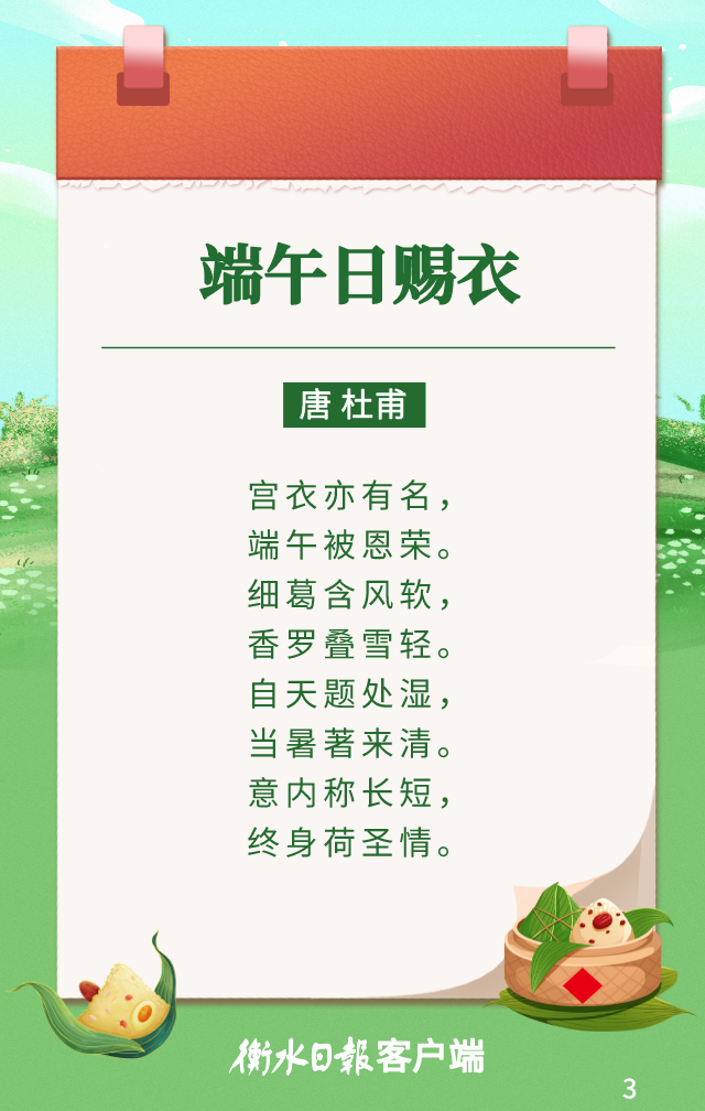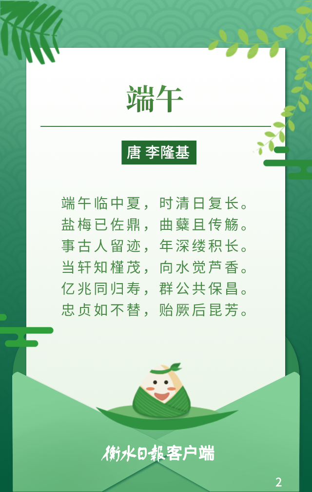 点赞 +1 微博 微信 我要评论 发布 相关推荐 网络中国节·端午丨诗句里的端午,你AI了吗 关注 2025-05-31 水墨端午 | 跨越千年的诗画风物之旅 要闻 2023-06-22 衡水市举办“人生如逆旅 我亦是行人”端午诗会 衡水速览 2023-06-21 诗词里的端午 | 守护传统,传承你我共同的血脉和根源 关注 2022-06-06 诗读端午 | 怀念与期盼 同在记忆深处 关注 2022-06-06 着汉服 诵经典 衡水朗诵爱好者举办“沧浪清兮”汉装端午诗会 壹现场 2022-06-03 热门 一天 三天 一周 1 当“超级充电宝”装上“智慧大脑”——河北武强鸿布储能电站探访 2 衡水籍运动员米兰冬残奥会上再摘银! 王鹏耀获单板滑雪项目亚军 3 一块酥糖 四代人的“甜蜜”守护——记支恒良酥糖制作技艺传承人支欣来 4 武强县吹响春管“冲锋号”力保夏粮丰收 5 衡水市道德模范石立泉走进市永安路小学开展红色主题少先队队会 6 衡水胡堂暗涵绿地海绵改造有序推进 7 提升消费品质|衡水移动多维度开展“3·15”主题系列活动 8 2026年“金融3·15”特别报道|衡水银行:坚持服务保护并重 守护安心金融消费 9 社区“摆摊”讲防骗 武邑居民家门口学到“3·15”维权硬知识 10 习近平的两会时间丨开局 1 人勤春来早 春管正当时——衡水市扎实推进春季农业生产纪实 2 【新闻发布】每人每月最高800元 衡水向中度以上失能老年人发放养老服务消费补贴 3 【乡村行 看振兴】棚室轮作种植 果蔬四季“生金” ——看董师傅如何算好“增收账” 4 武强县开展“3・15”金融消费者权益保护宣传活动 5 一方小田园 “种”出新生活——衡水滨湖新区开心农场春管见闻 6 衡水市将于4月初开展残疾人运动员选拔工作 7 河北水务有限公司衡水管理处开展植树节活动 8 2025年衡水民用水电气三表更换惠及24.5万人 9 衡水市启动社会救助兜底保障集中核查工作 10 衡水:滏阳河畔春意浓 繁花似锦醉春风 1 《中华人民共和国献血法》首次修订——这些变化和每位献血者有关 2 春回大地寻野趣!衡水市民踏青挖野菜 安全尝鲜需谨记 3 衡水籍运动员刘晓彬米兰冬残奥会上夺银 4 “巾帼芳华 为爱赴约” 衡水市总工会举办青年职工相亲交友活动 5 春风送岗暖民心 衡水故城县举办残疾人专场招聘会 6 值班总编说报|春潮涌动千帆竞 实干争先万象新 7 一场制造业的“数字春雨”——衡水市景县优化营商环境一线探访 8 政策宣讲 岗位对接 衡水市开展“春风行动”招聘会暨“情暖三八 社保护航”主题宣传活动 9 阜城县企业数字化转型培训会赋能产业转型升级 10 守护安全 畅通消费 衡水市2026年“3·15国际消费者权益日”系列活动启动 广告 广告 广告 24小时 1 壹视界·总书记两会“下团组”|健康中国怎么建?总书记这样强调 2 习言道|总书记的两会足迹 3 建行武邑支行:创新金融服务 赋能科技企业升级发展 4 工行安平支行开展"金融为民"志愿服务 暖心帮扶特殊群体 5 工行阜城支行金融活水赋能医用包装企业“智造”升级 6 工行故城支行专精特新贷支持“小巨人”转型蝶变 7 工行枣强支行"科创贷"精准赋能 助企实现“科技变现” 8 建行安平支行开展"守住钱袋子 护好幸福家"金融教育宣传活动 9 建行景县支行组织开展"普及社保卡 幸福千万家"主题宣传活动 10 建行枣强支行组织女员工开展烘焙活动
