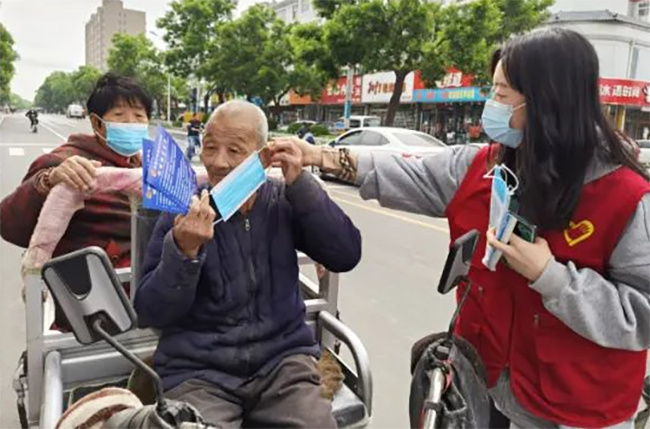 志愿者们向没有佩戴口罩的群众发放口罩。景县融媒体中心供图