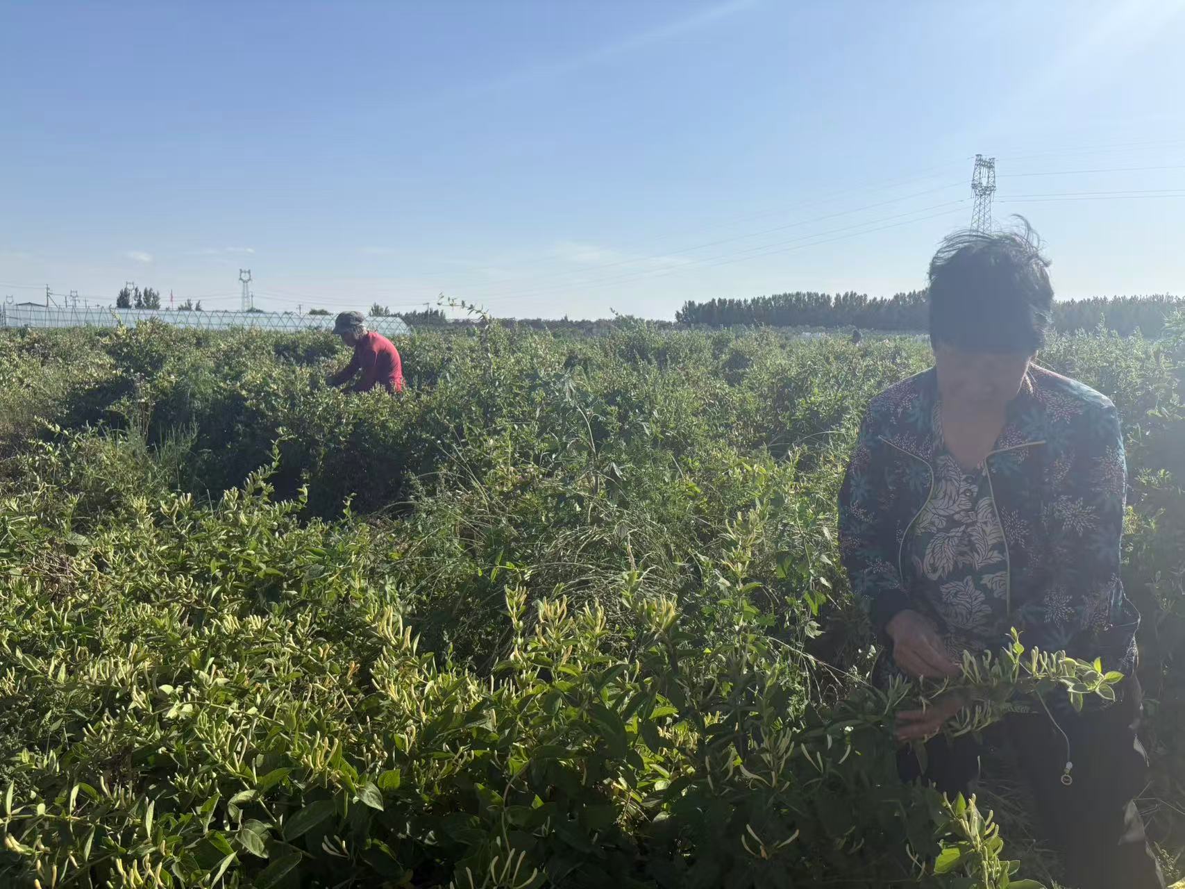 在衡水市阜城县古城镇辛集村的金银花种植基地内,一株株金银花迎风摇曳,淡淡的花香弥漫在空气中,沁人心脾,丰收景象尽收眼底,村民们正在熟练地采摘着金银花,忙碌不停。