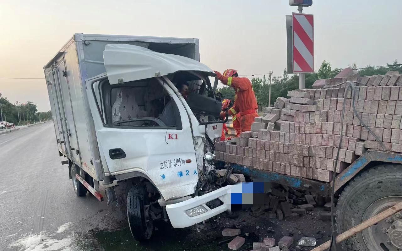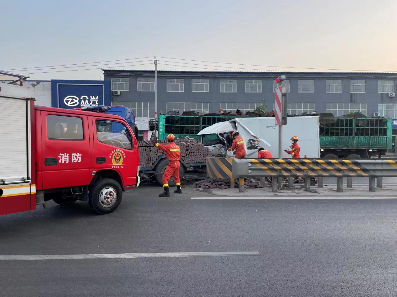 6月8日4时45分,深州市消防救援大队接到报警称,深州市307国道枣科段发生一起交通事故,一辆厢式货车与一辆拉砖拖拉机发生追尾事故,砖撒了一地,货车司机被困驾驶室。深州市消防救援大队迅速调派永平大街消防救援站,出动2车9人赶赴现场实施救援。