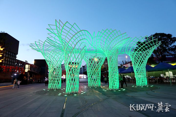 日渐黄昏,华灯初上,公园里奥运五色树、蒸汽机车、“小蛮腰”灯光塔、詹天佑铜像等景观区流光溢彩,熠熠生辉,大人、孩子争相合影留念。